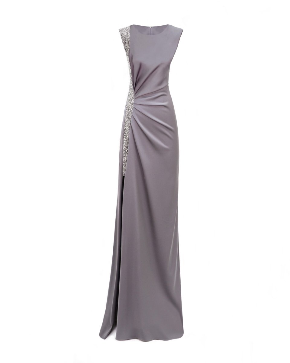 وصف:فستان بقصة ضيقة مع طيات على الخصر وخطوط من الخرز على أحد الجانبين مع شق مفتوح.