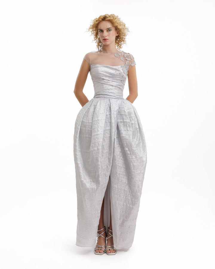 فستان برقبة عالية وأكتاف