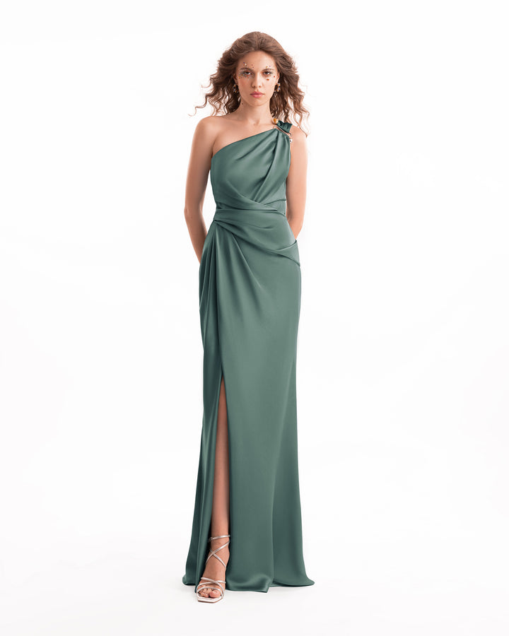 فستان طويل مطوي مع فتحة صدر على شكل V