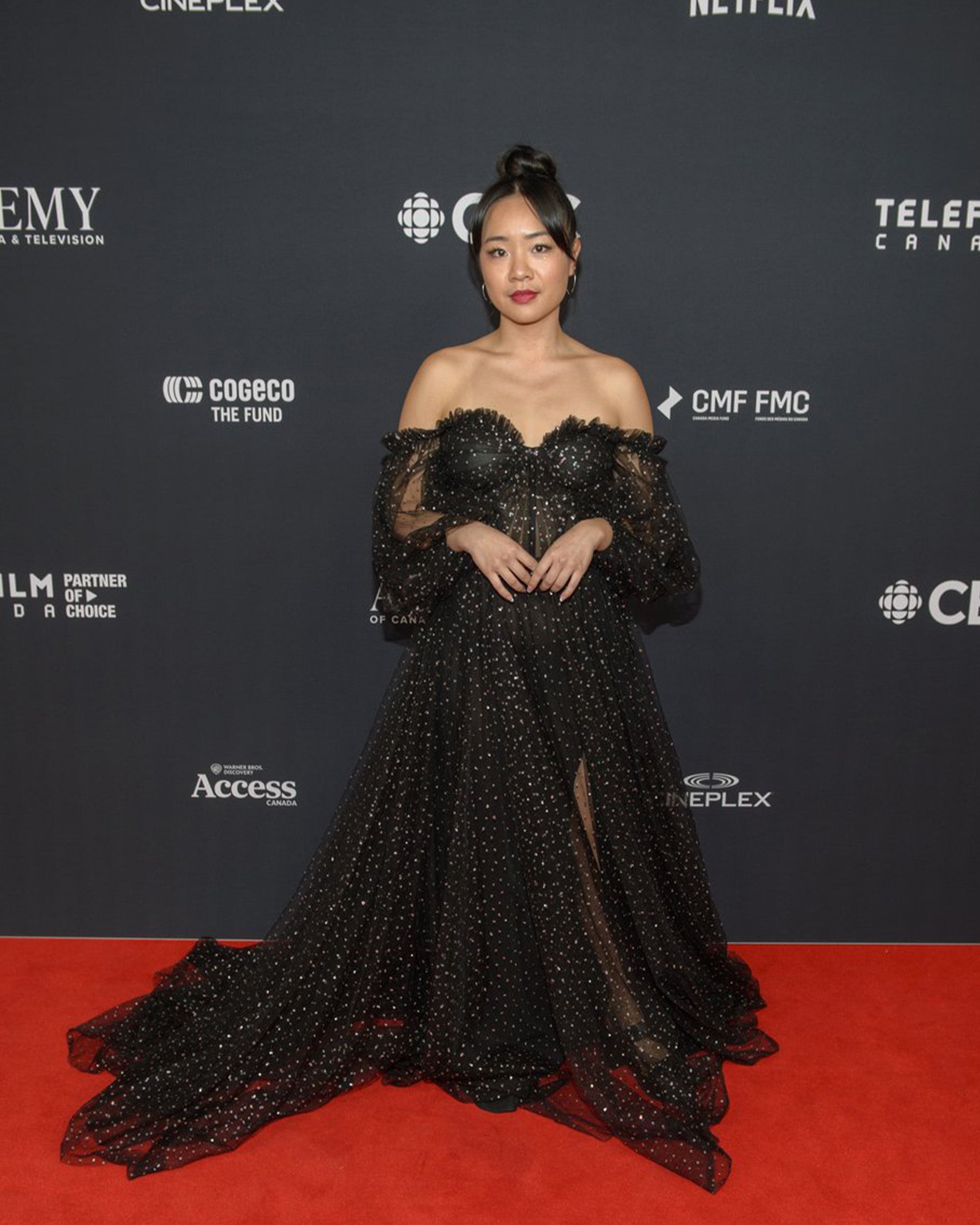 جينيفر تونغ ترتدي فستاناً لامعًا من قماش جيمي معلوف. كانت أحد أفضل النجمات المرتدين اللواتي حضروا حفل توزيع جوائز الشاشة الكندية لعام ٢٠٢٣