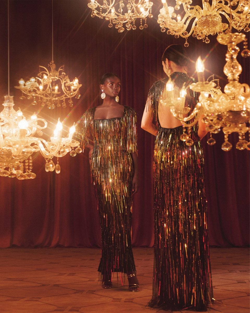 وصف:فستان مزين بالكامل بالخرز يتميز بفتحة رقبة مربعة وأكمام بطول ثلاثة أرباع.