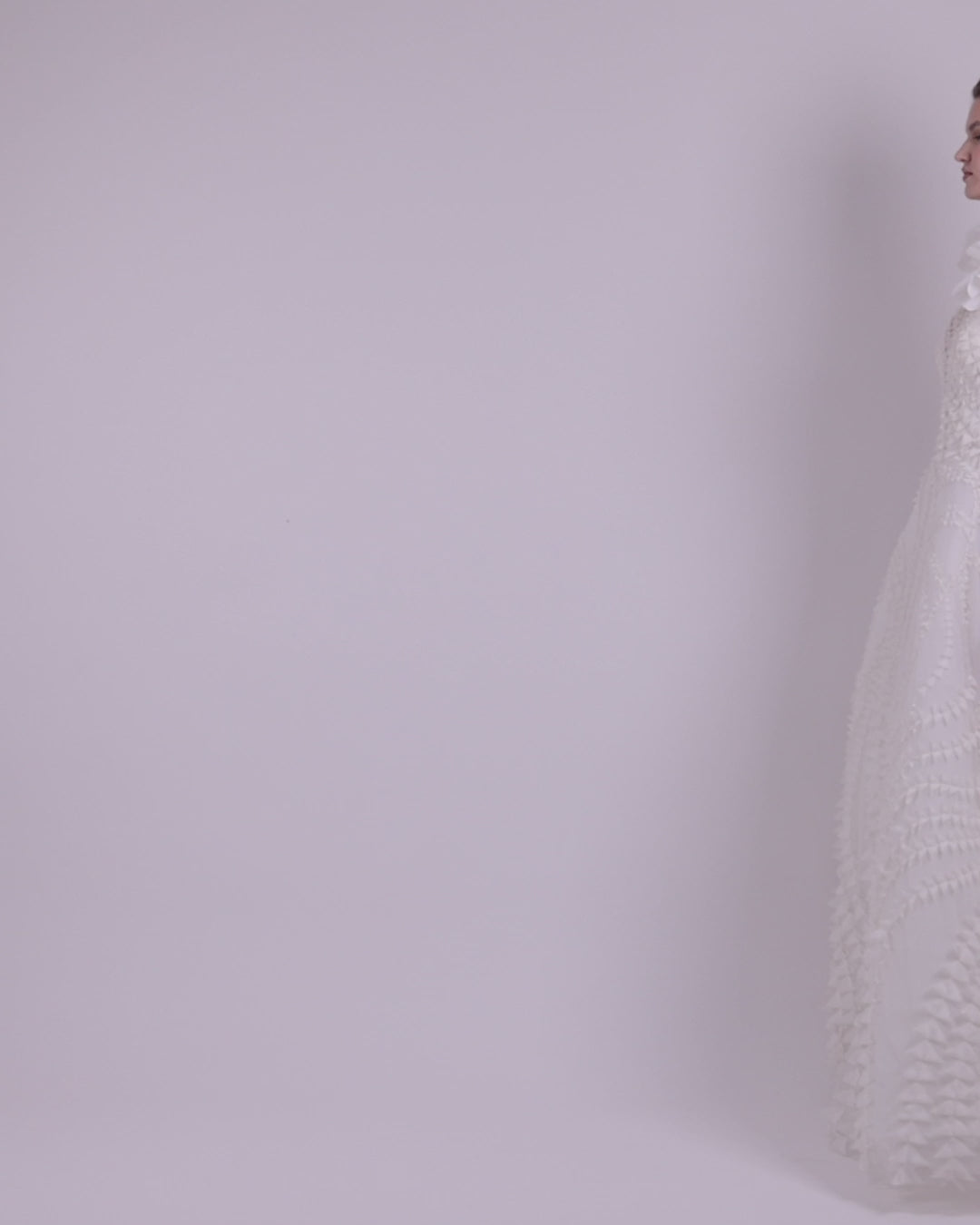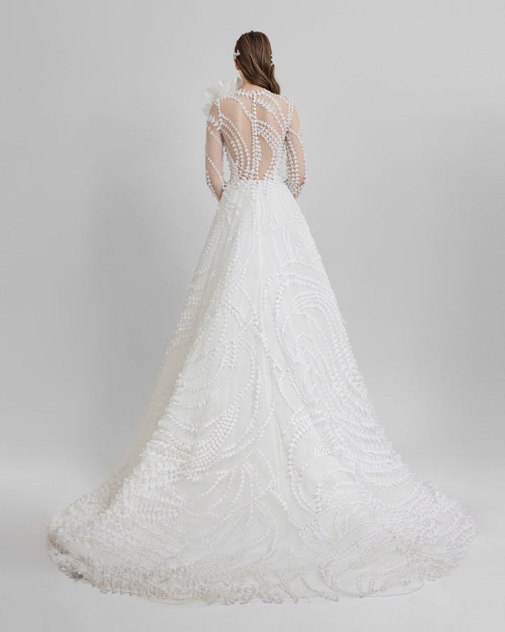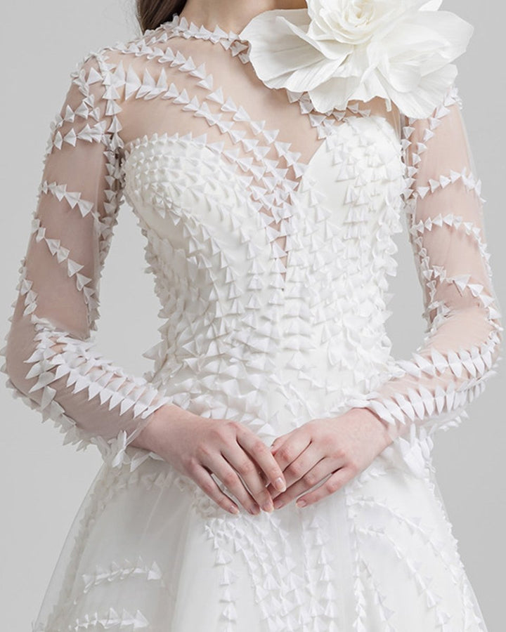 الوصف: فستان بقصة ليزر مع أكمام شفافة، رقبة V وبروش بشكل وردة.