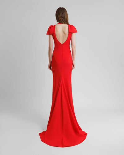 وصف:فستان طويل بقصة ضيقة وفتحة رقبة على شكل حرف V مع فيونكات على الكتفين وظهر مفتوح.