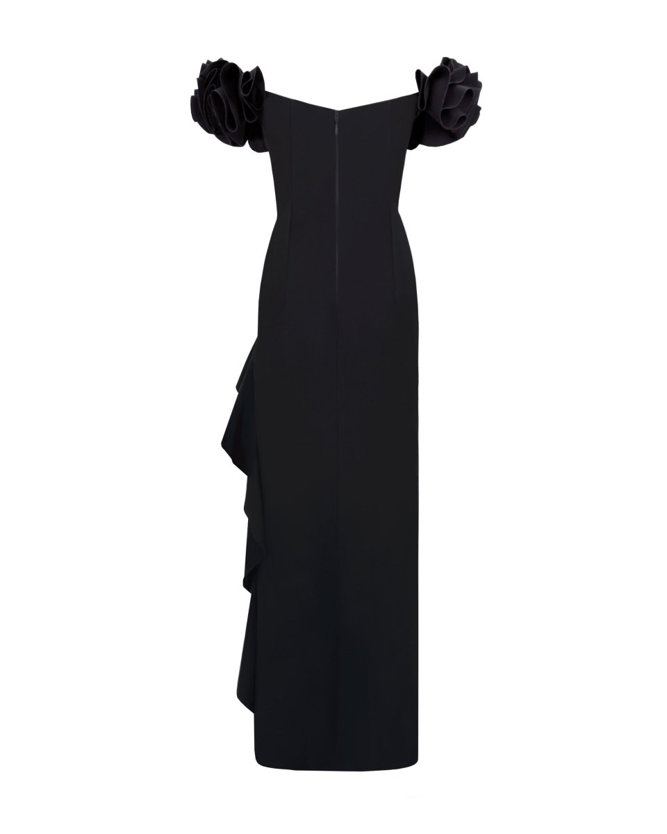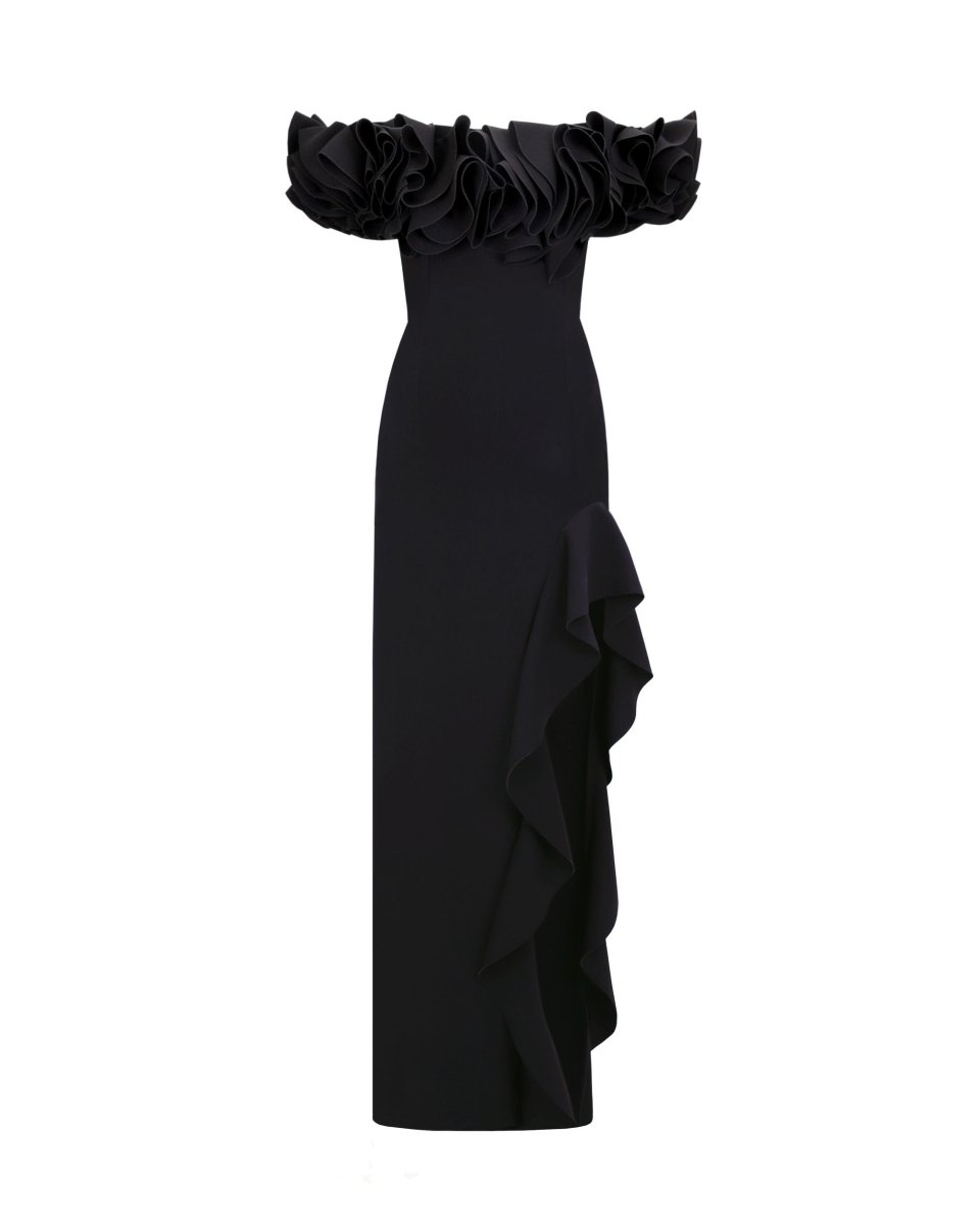 وصف:فستان من الكريب مكشوف الأكتاف مع تنورة غير متماثلة بتفاصيل مكشكشة وشق على الجانب.