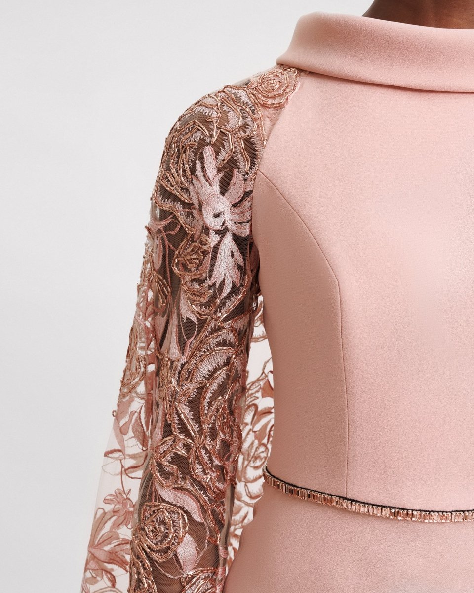 وصف:فستان بقصّة نحيفة مع ياقة قابلة للطي، وخصر من الخرز، وأكمام تشبه العباءة.