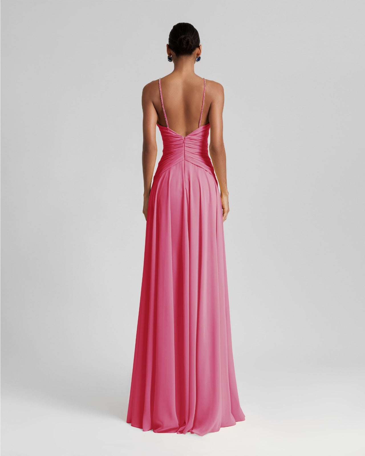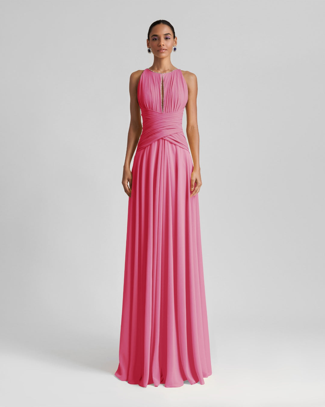 وصف:فستان طويل يتميز بثنيات على الخصر وفتحة رقبة مرصعة بالخرز وظهر مفتوح.