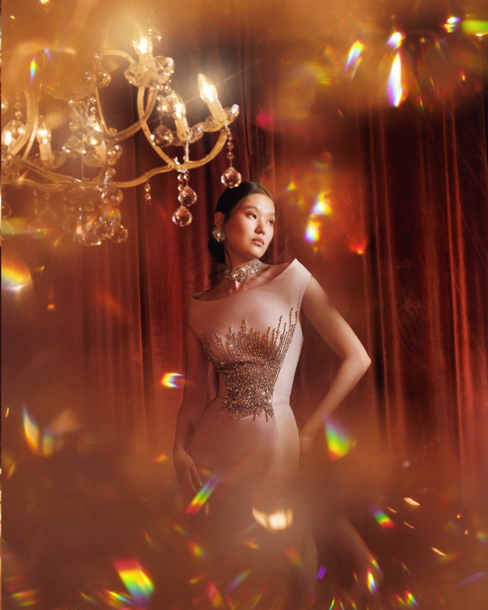 وصف:فستان بقصّة نحيفة يتميز بفتحة صدر على شكل قارب بدون حمالات وياقة قابلة للفصل وخرز على الكورسيه وشقوق على الجانب.