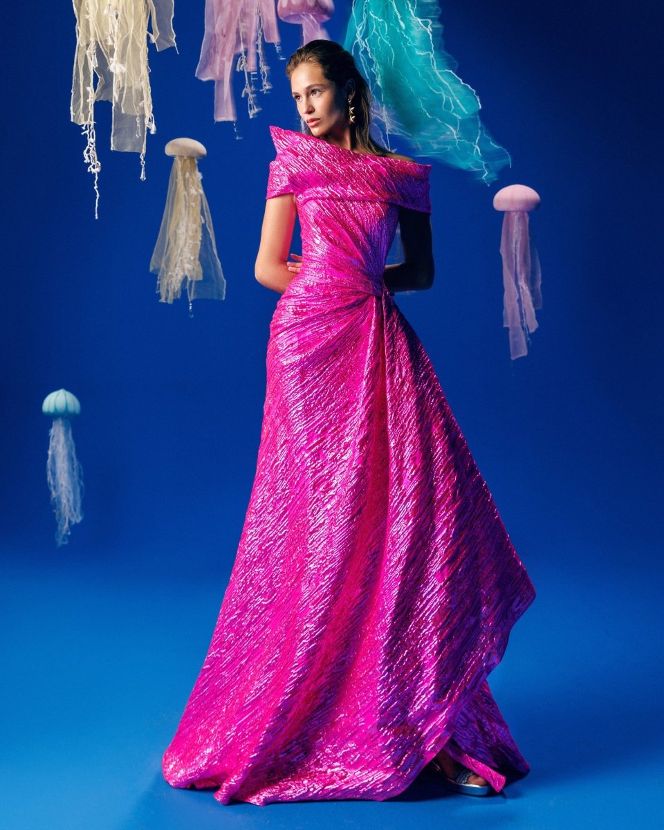 وصف:فستان ذو رقبة غير متماثلة وأكتاف مكشوفة وخصر منسدل.