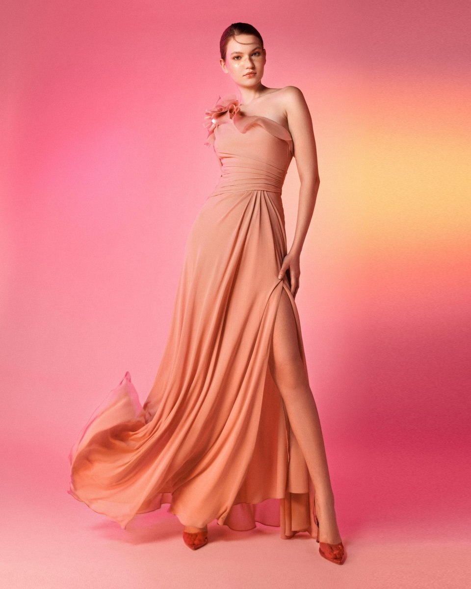 فستان بكتف واحد وثنيات