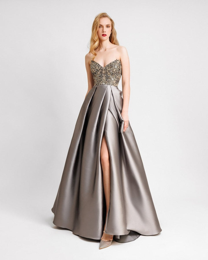 وصف:فستان كورسيه بدون حمالات مزين بالخرز مع تنورة كاملة منسدلة تتميز بشق جانبي وظهر منخفض.