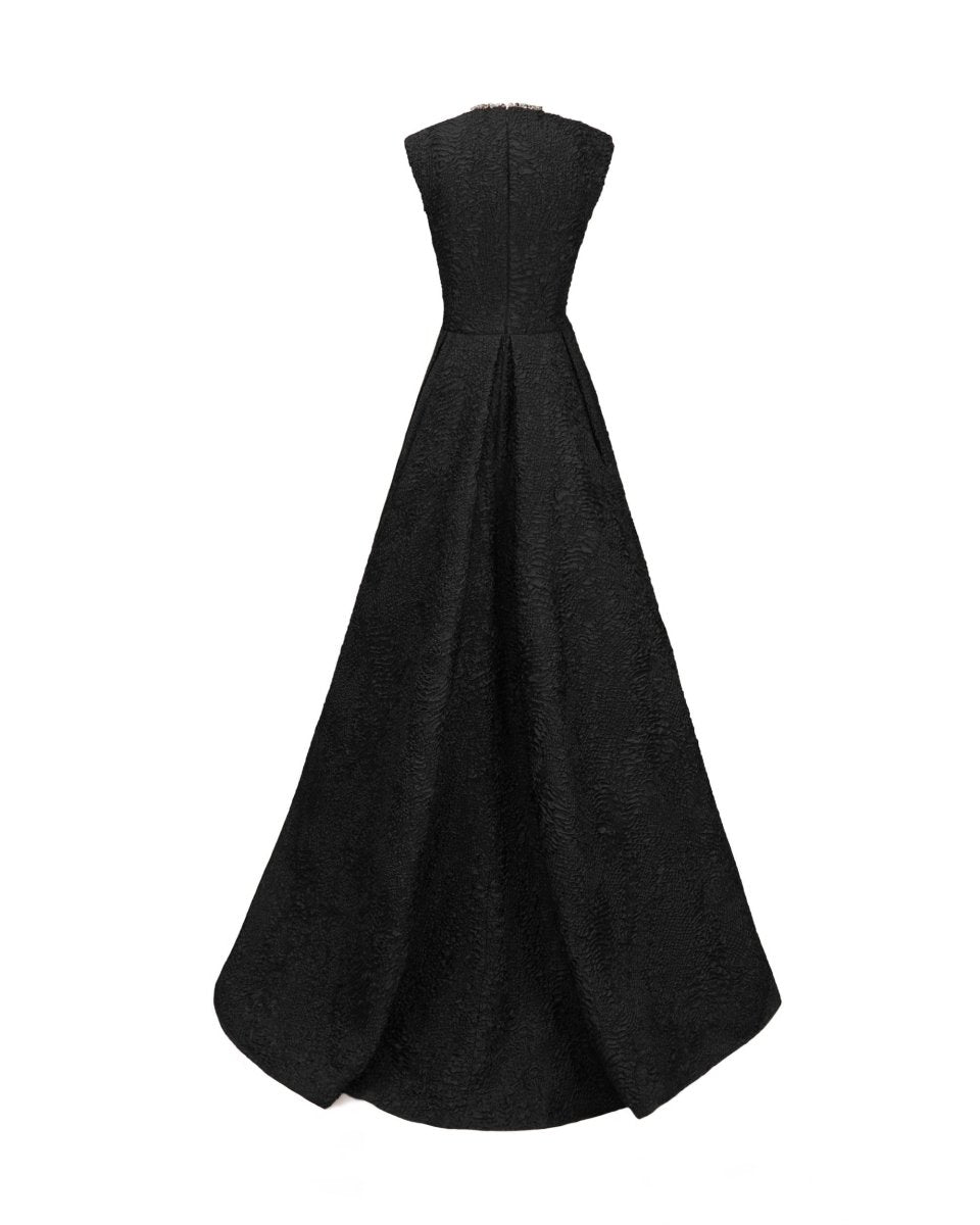 وصف:فستان مزين بفتحة رقبة على شكل حرف V وأكتاف منظمة وتنورة واسعة منسدلة.
