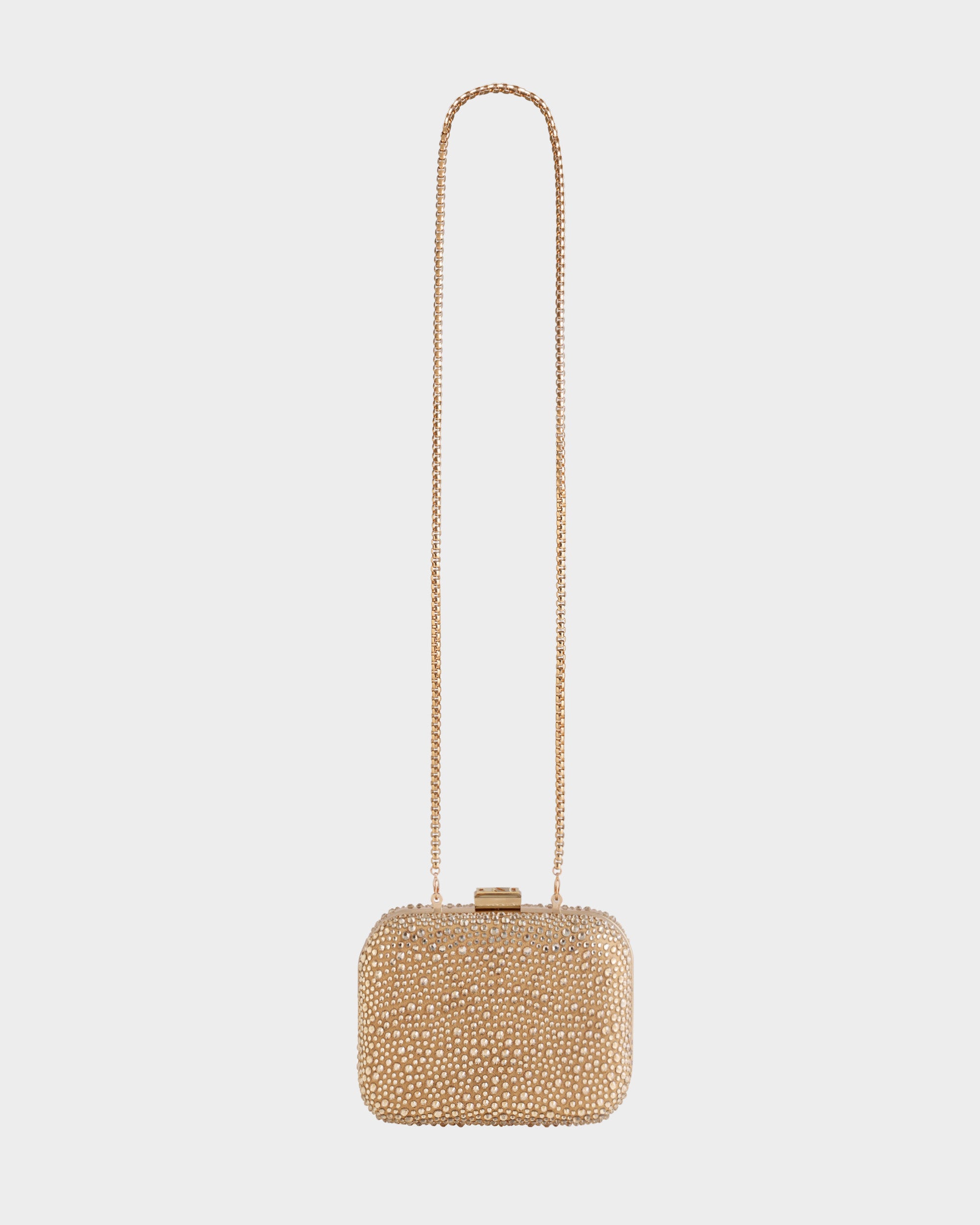الوصف: كلتش من الكريب المزيّن بالكريستال، مزوّد بقطع معدنية باللون الذهبي، وبطانة داخلية من الجلد، مع حزام سلسلة قابل للفصل.