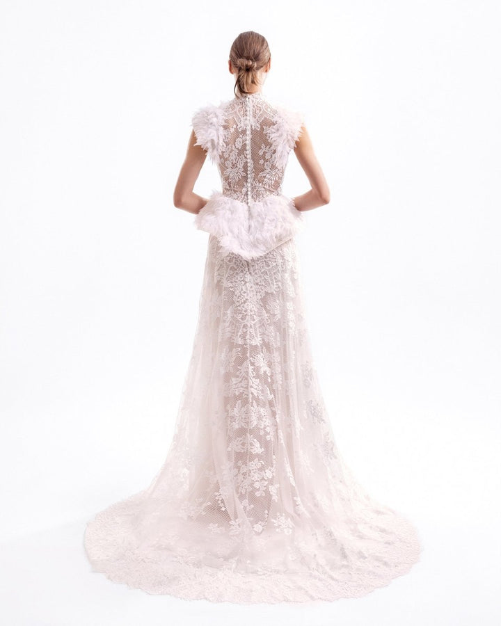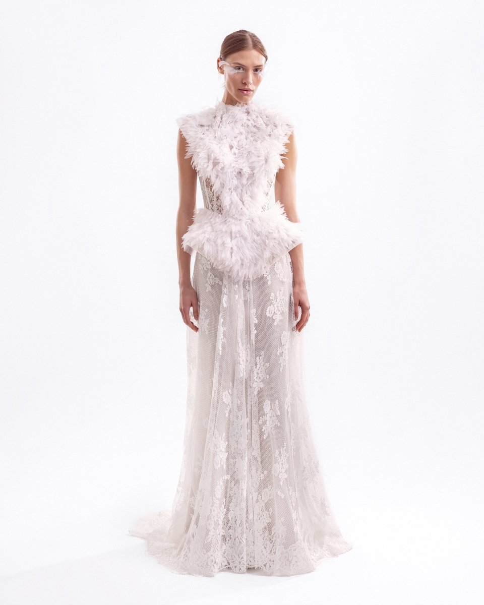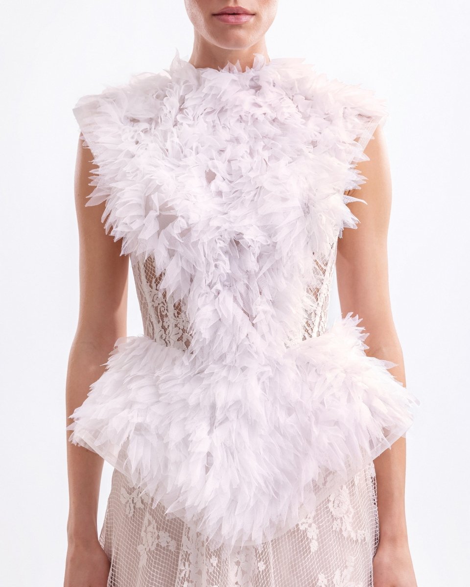 فستان طويل من التول والدانتيل المكشكش، يتميز بكتفين وخط خصر مُحددين مع ظهر شفاف.