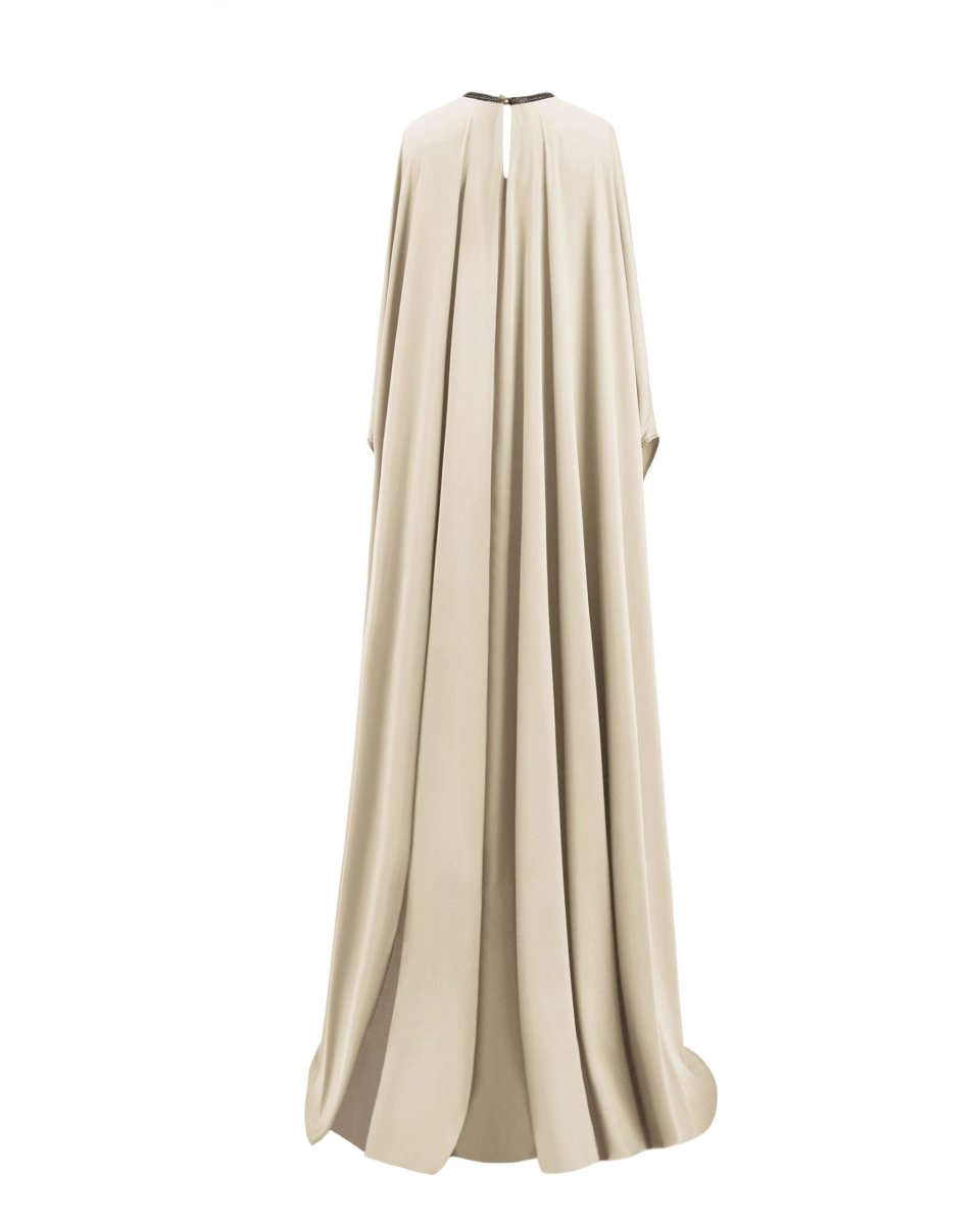 وصف:فستان على طراز القفطان مع رقبة منسدلة مزينة بالخرز، وأكمام بطول ثلاثة أرباع وحاشية مزينة بالخرز.