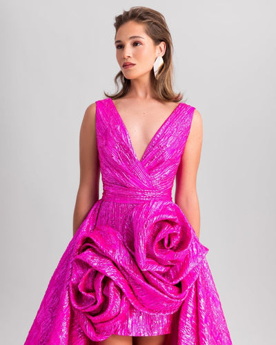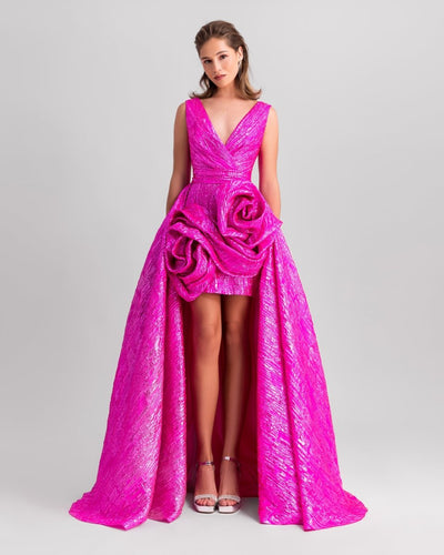 وصف:فستان ذو رقبة على شكل حرف V عميقة يتميز بأزهار منسدلة وذيل عريض منسدلة.