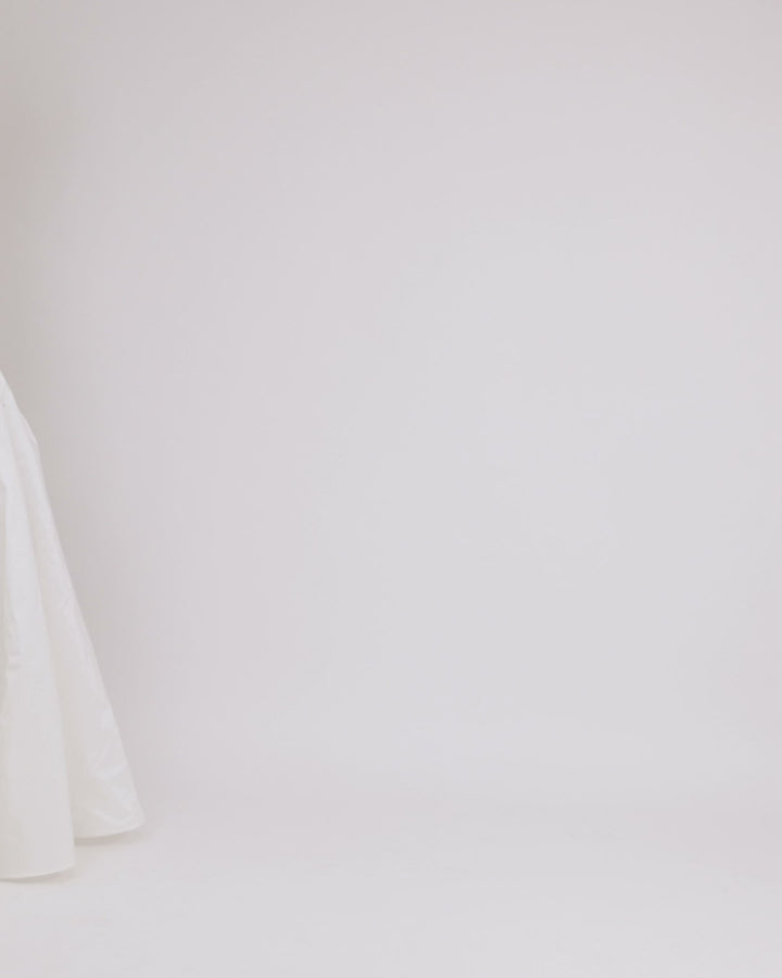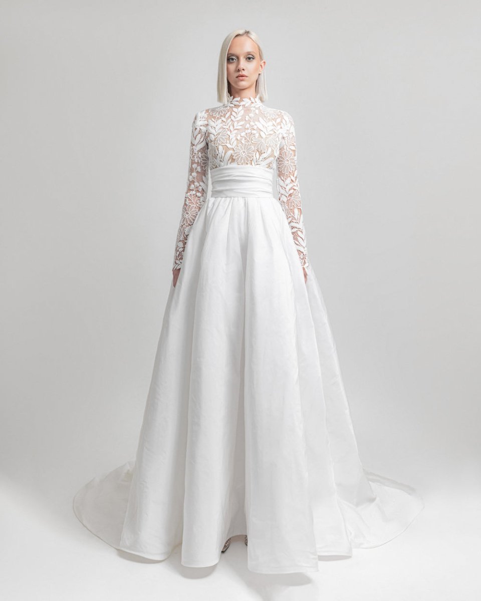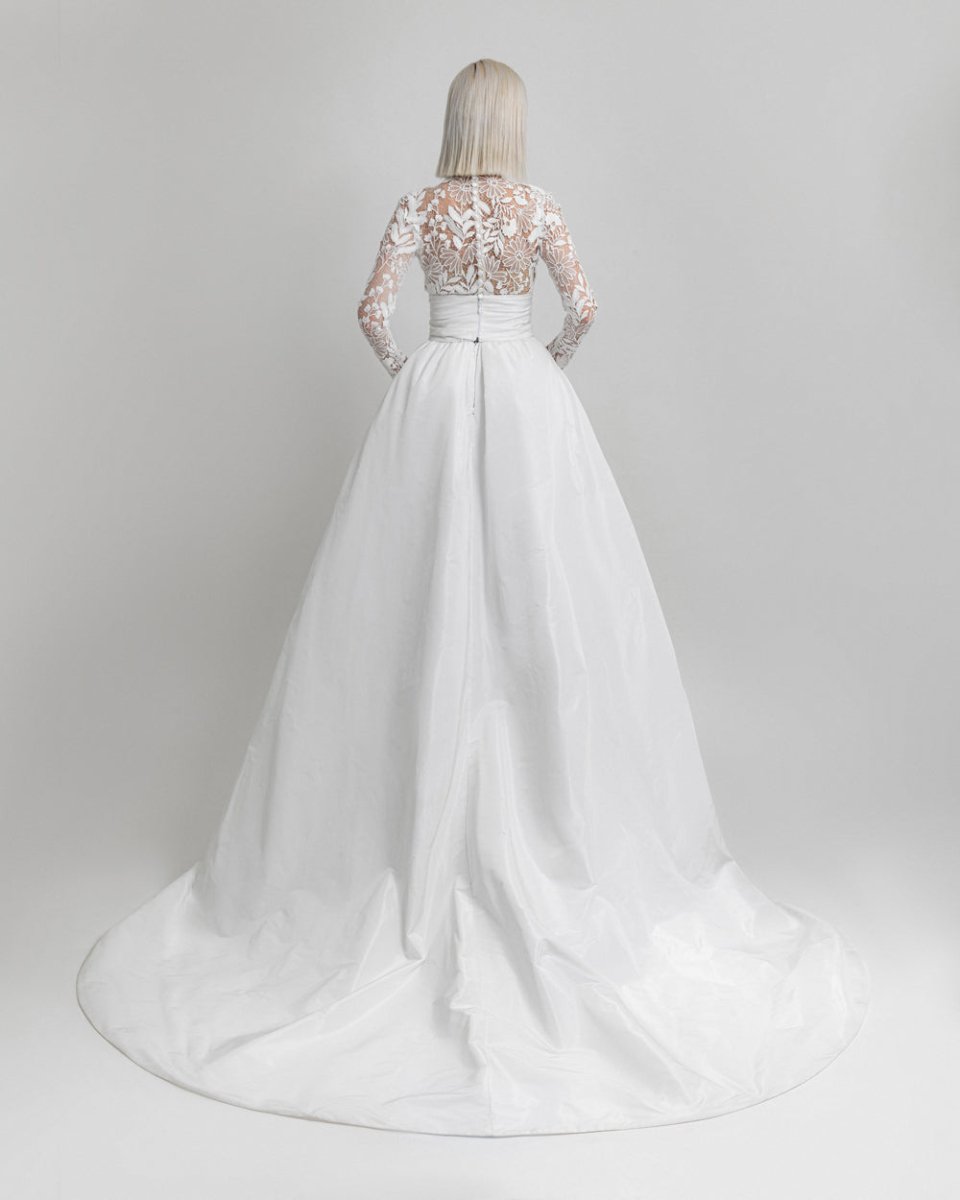 توب دانتيل بالكامل، متناسق مع تنورة تافيتا بقصة واسعة.