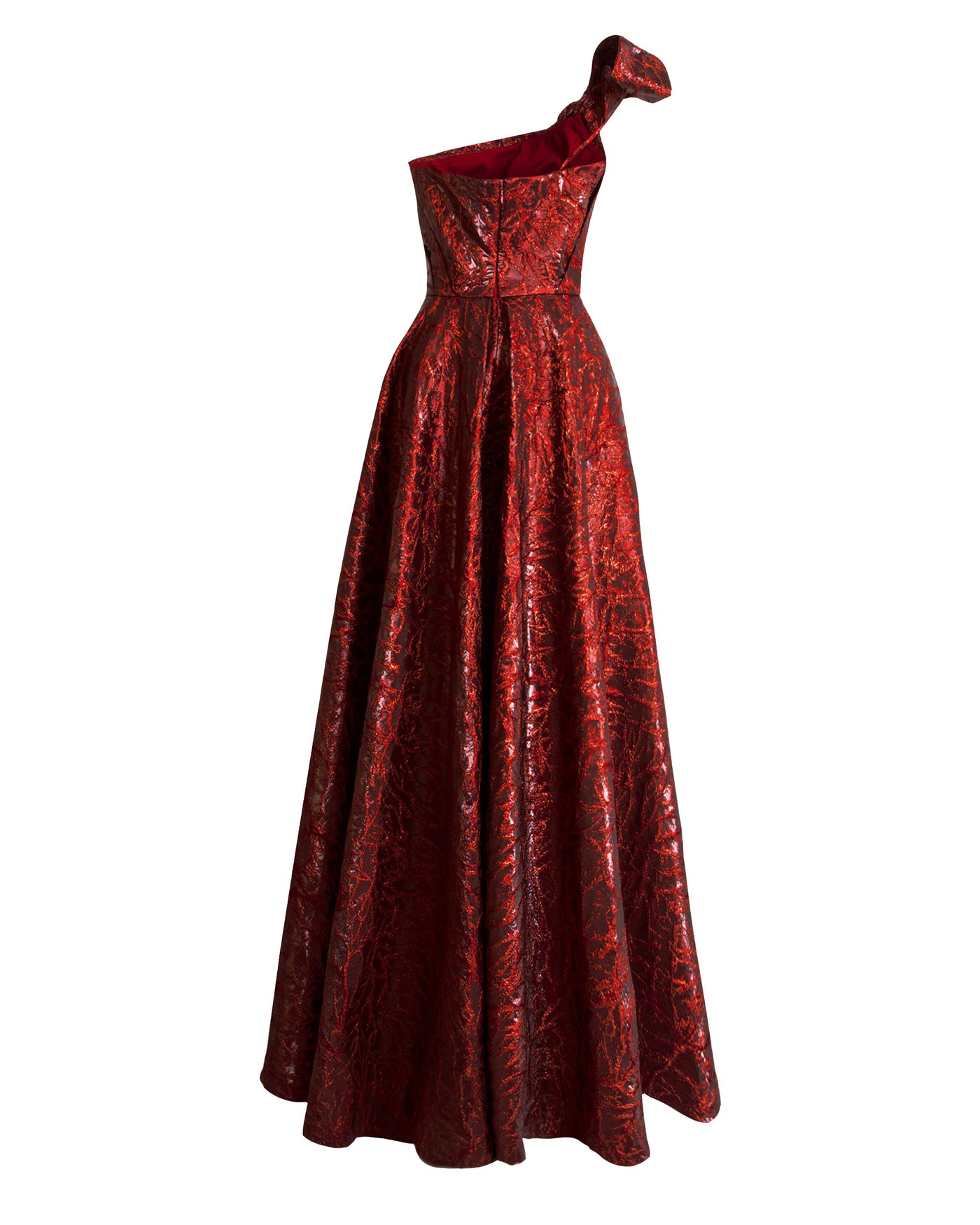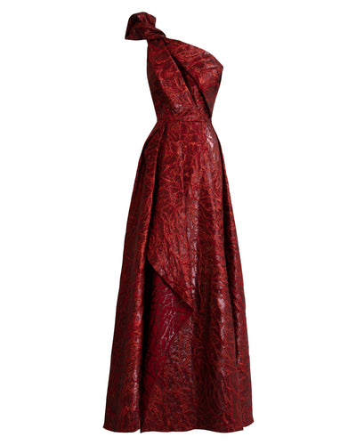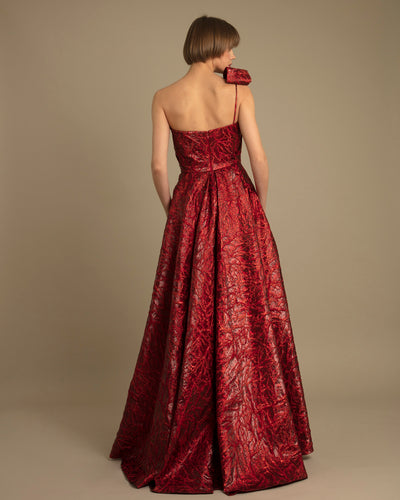 وصف:فستان منسدل بكتف واحد مع شق جانبي وظهر غير متماثل مزين بالشراشيب.
