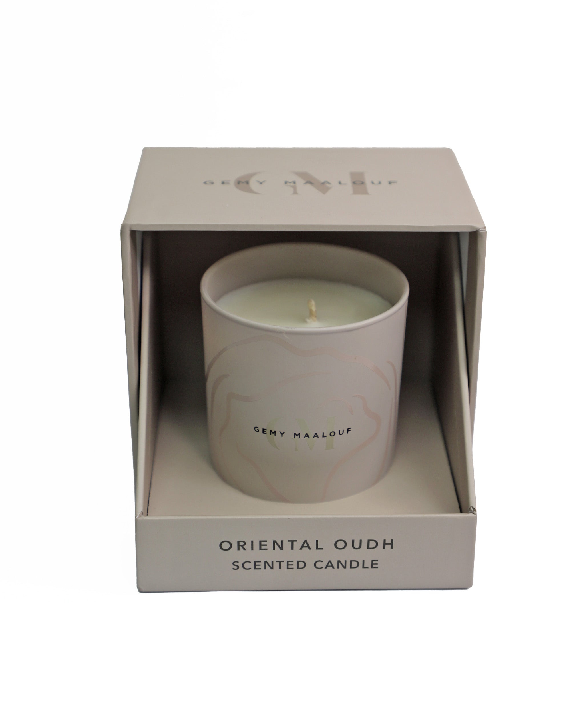 الوصف: شمعة معطرة بالعود الشرقي تقدم في رزمة بيج.