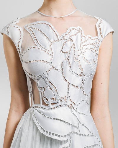 وصف:فستان قصير الأكمام يتميز بتفاصيل ساتان ثقيلة مقصوصة بالليزر بشكل غير متماثل على الصدر حتى الورك، مع قصات تُظهر بعضًا من قوامك. يتميز بظهر دائري مفتوح، وتحت التصميم غير المتماثل، تأتي تنورة طويلة من التول.