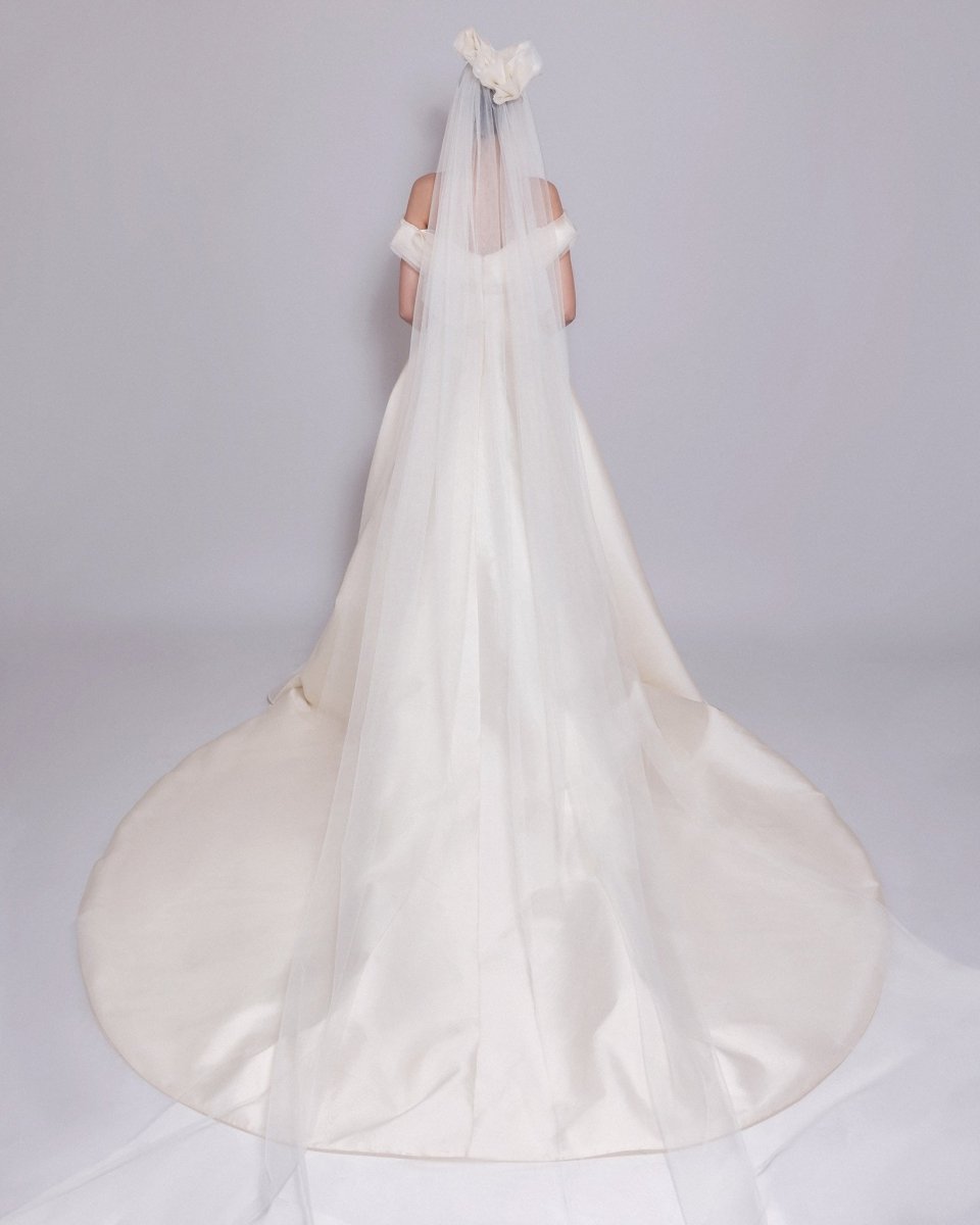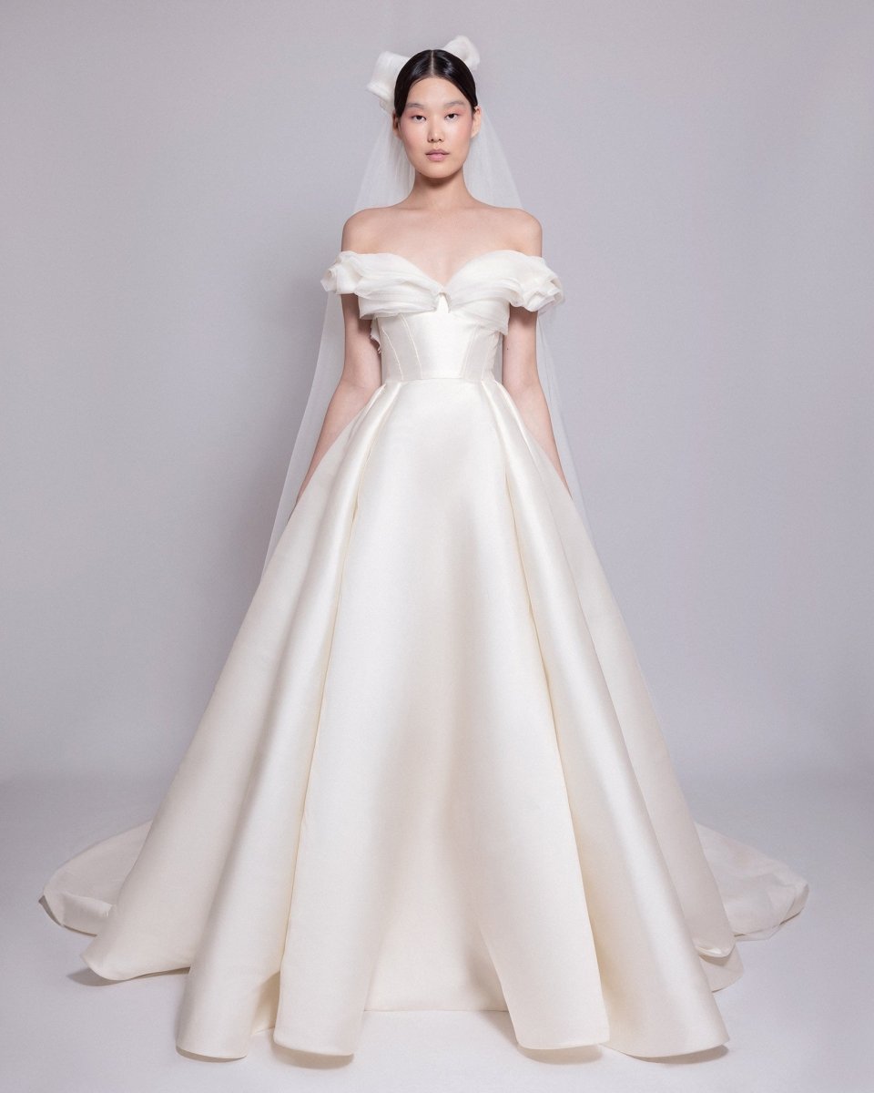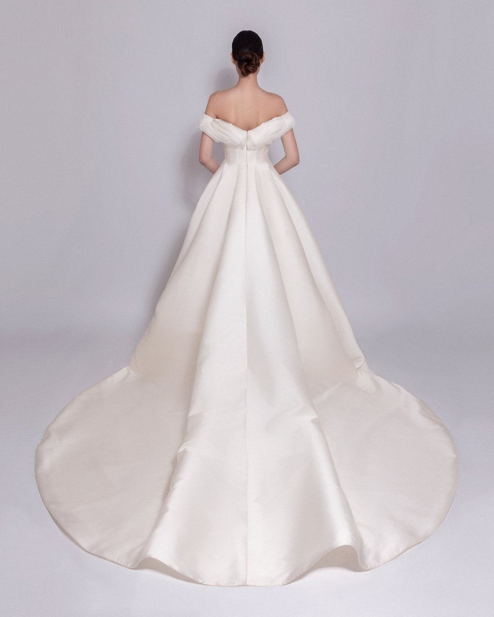 الوصف: فستان بأكتاف مكشوفة يتميز بياقة ناعمة مع قماش متجمع عند الأكتاف. الصدر مصمم بشكل محكم، مما يؤدي إلى تنورة A-line كلاسيكية واسعة، ومكمل بطرحة طويلة من التول.