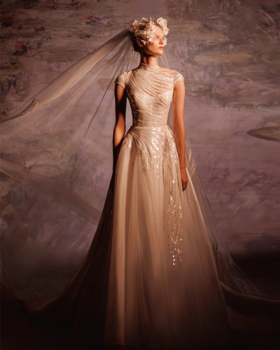 الوصف: فستان مطرز مع فتحة ظهر وأكمام كالرداء مع طرحة تول طويل.