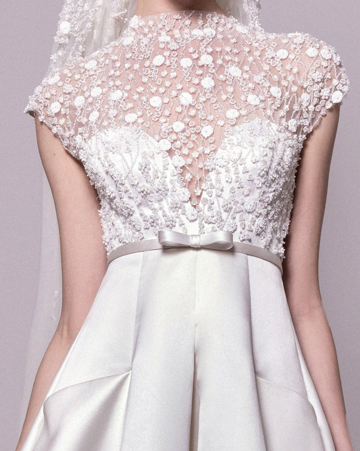 الوصف: فستان طويل مع كورسيه مطرز بالخرز وظهر شفاف منخفض، مقترن بطرحة طويلة مطرزة بالخرز مع تنورة داخلية قابلة للفصل.