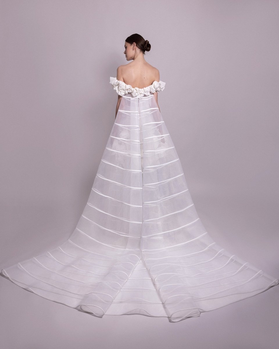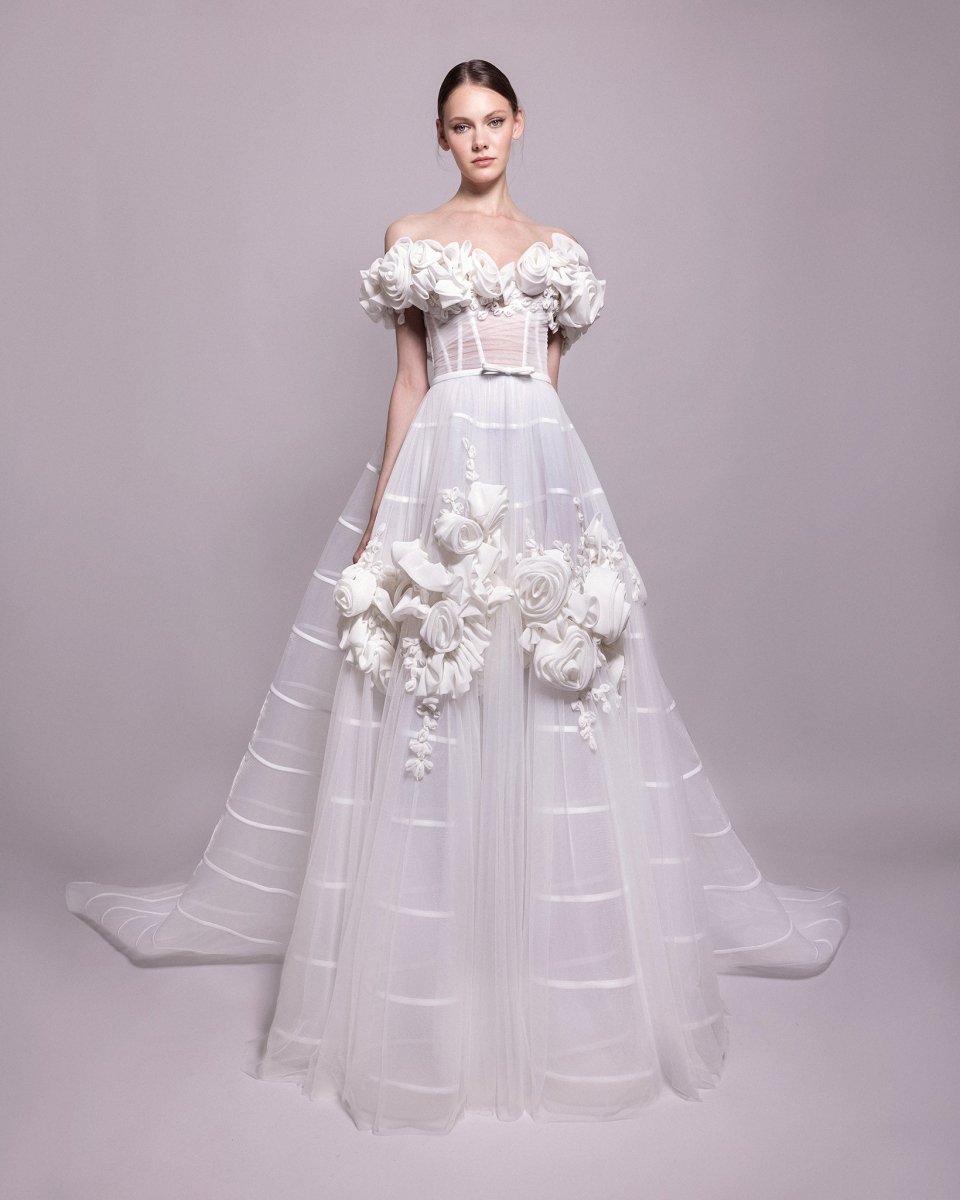 الوصف: فستان من على الكتفين مع زخارف منسدلة من الزهور وكورسيه شفاف، مقترن بذيل مفصول مزخرف من الكرينولين وطرحة طويلة.