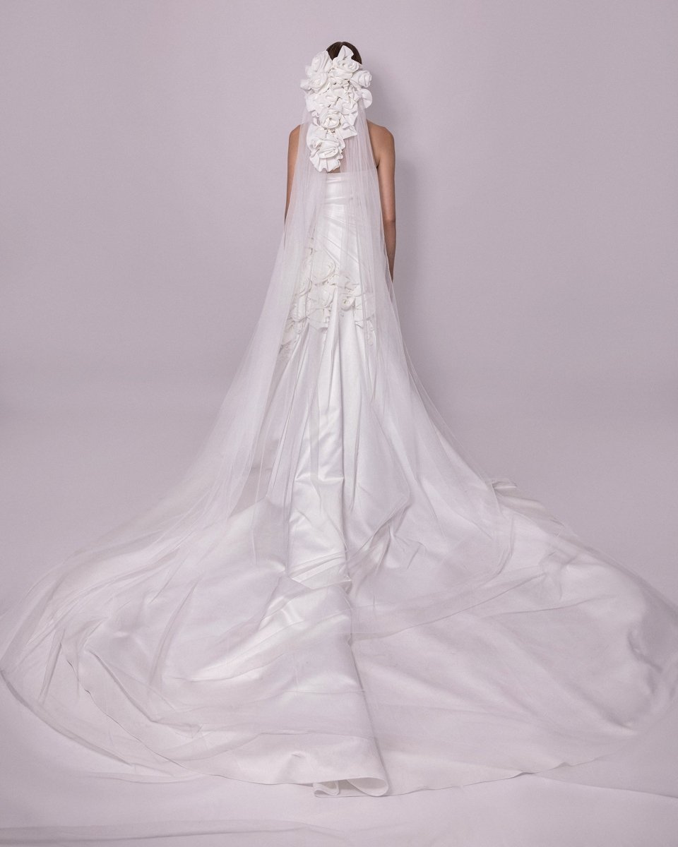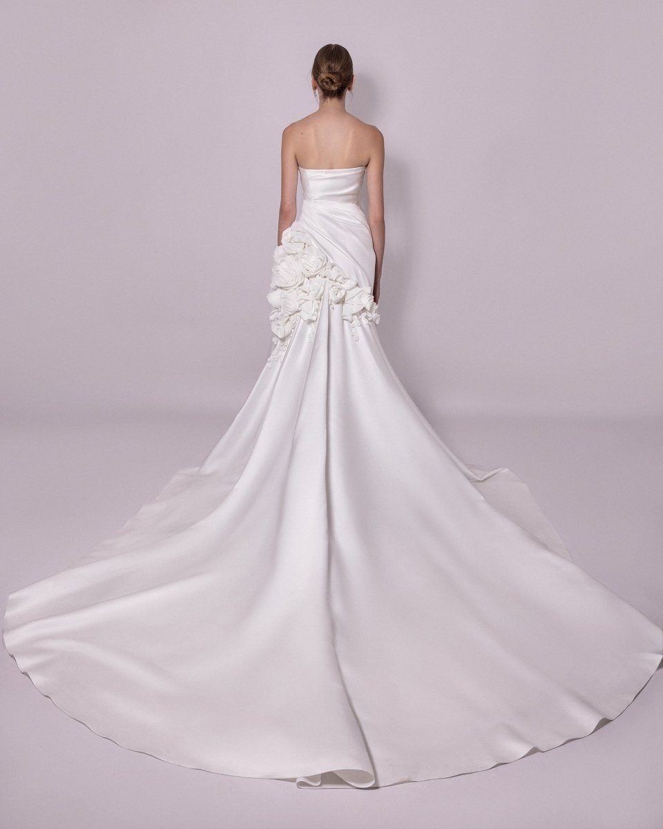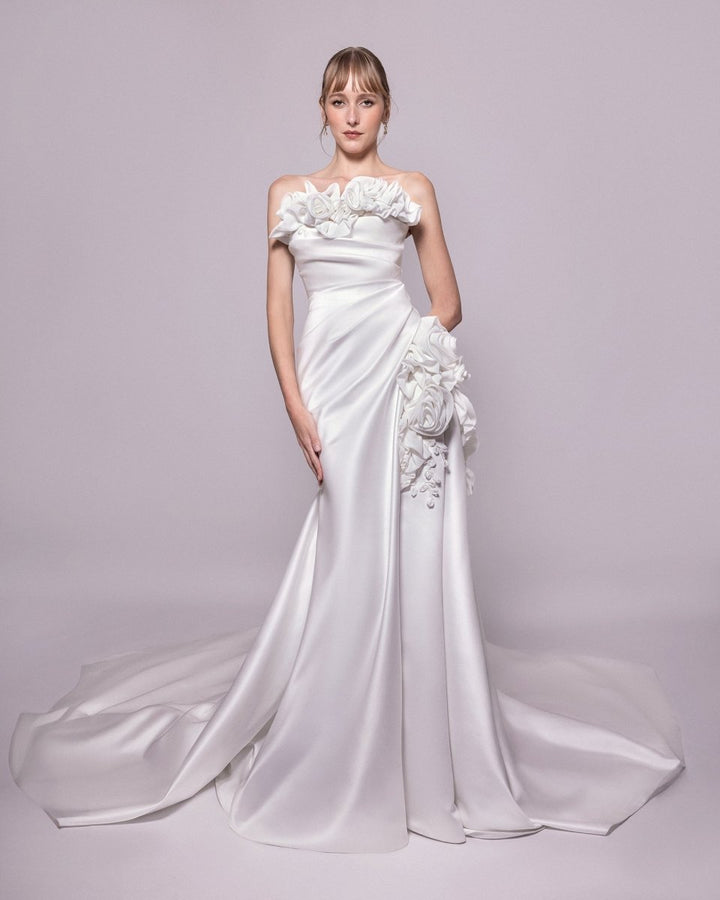 الوصف: فستان بدون حمالات مع زخارف منسدلة من الزهور على الجانب والرقبة، مقترن بطرحة طويلة.