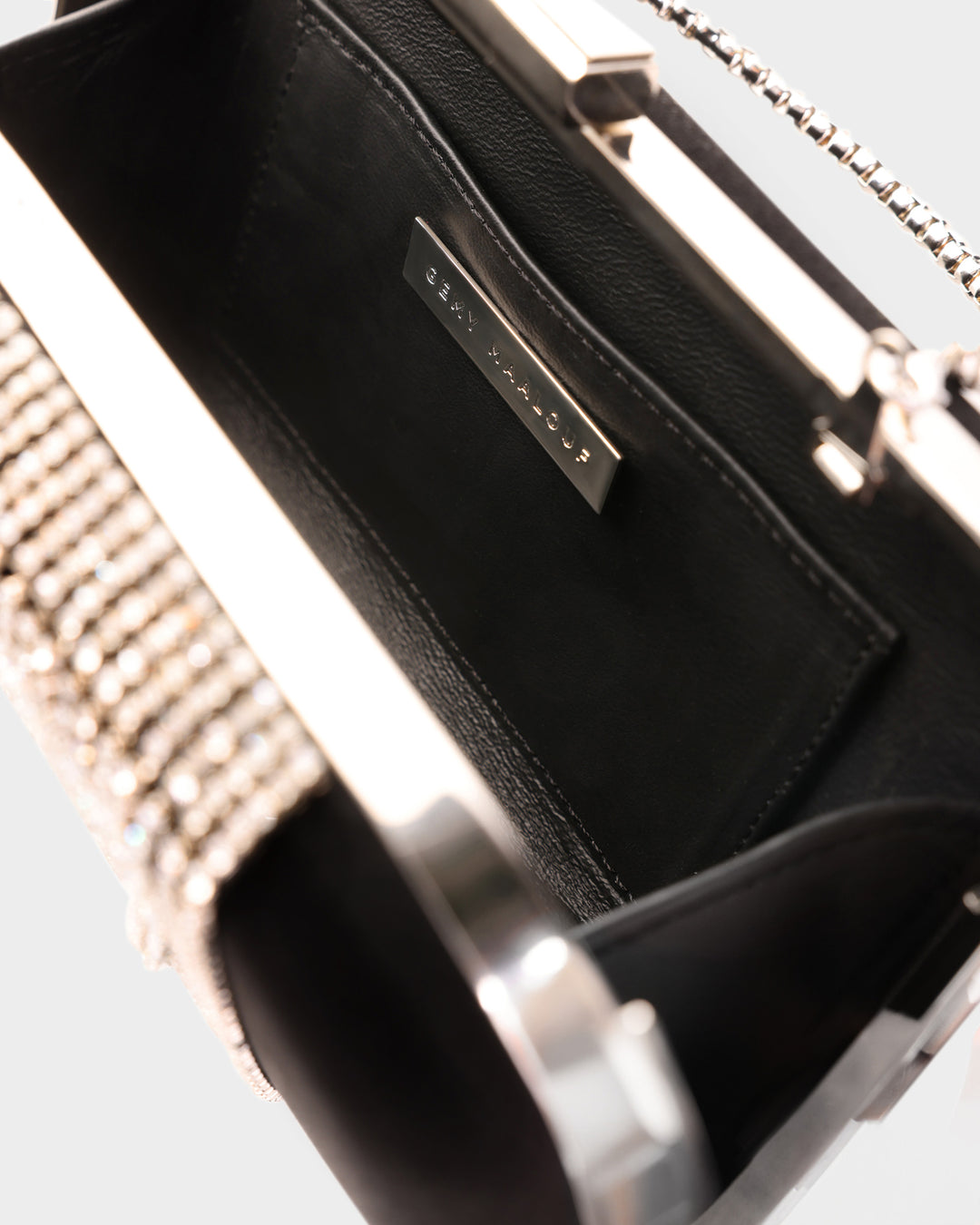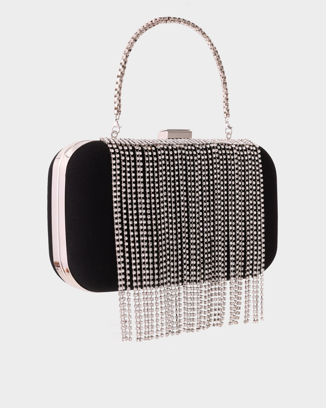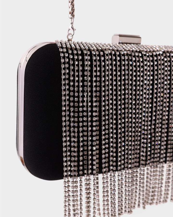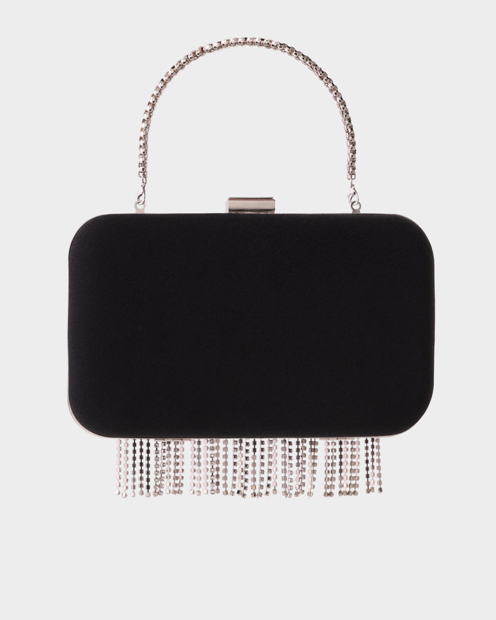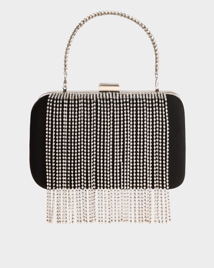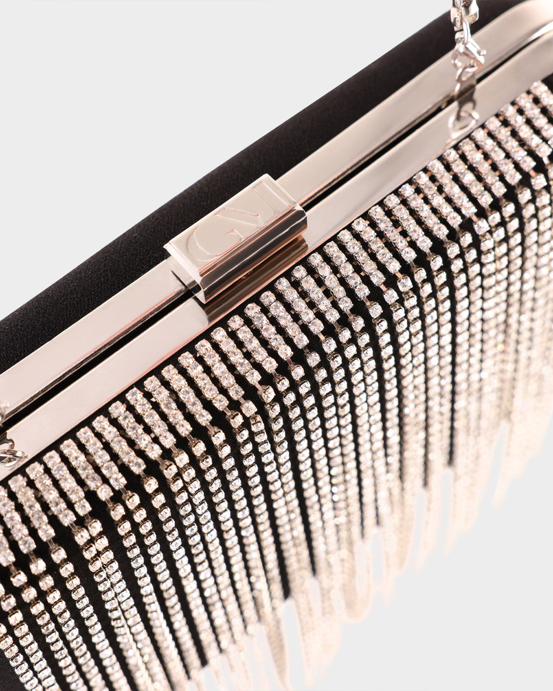 Description: Crepe clutch with gold hardware and Stone Fringes.