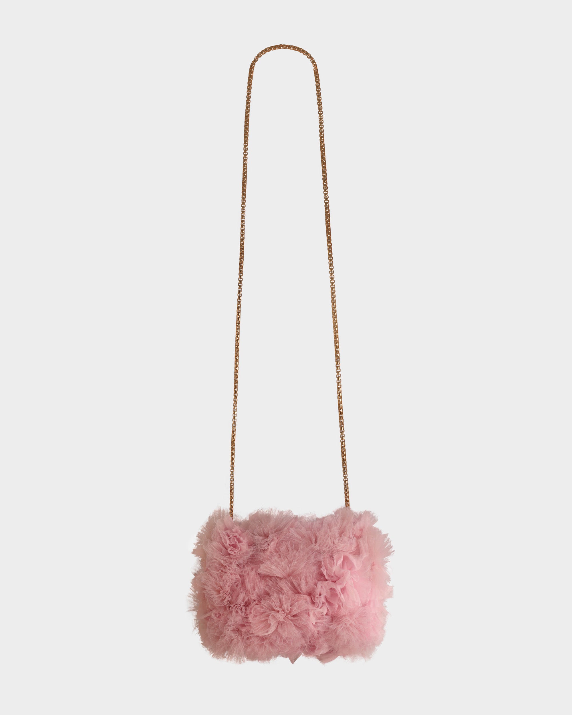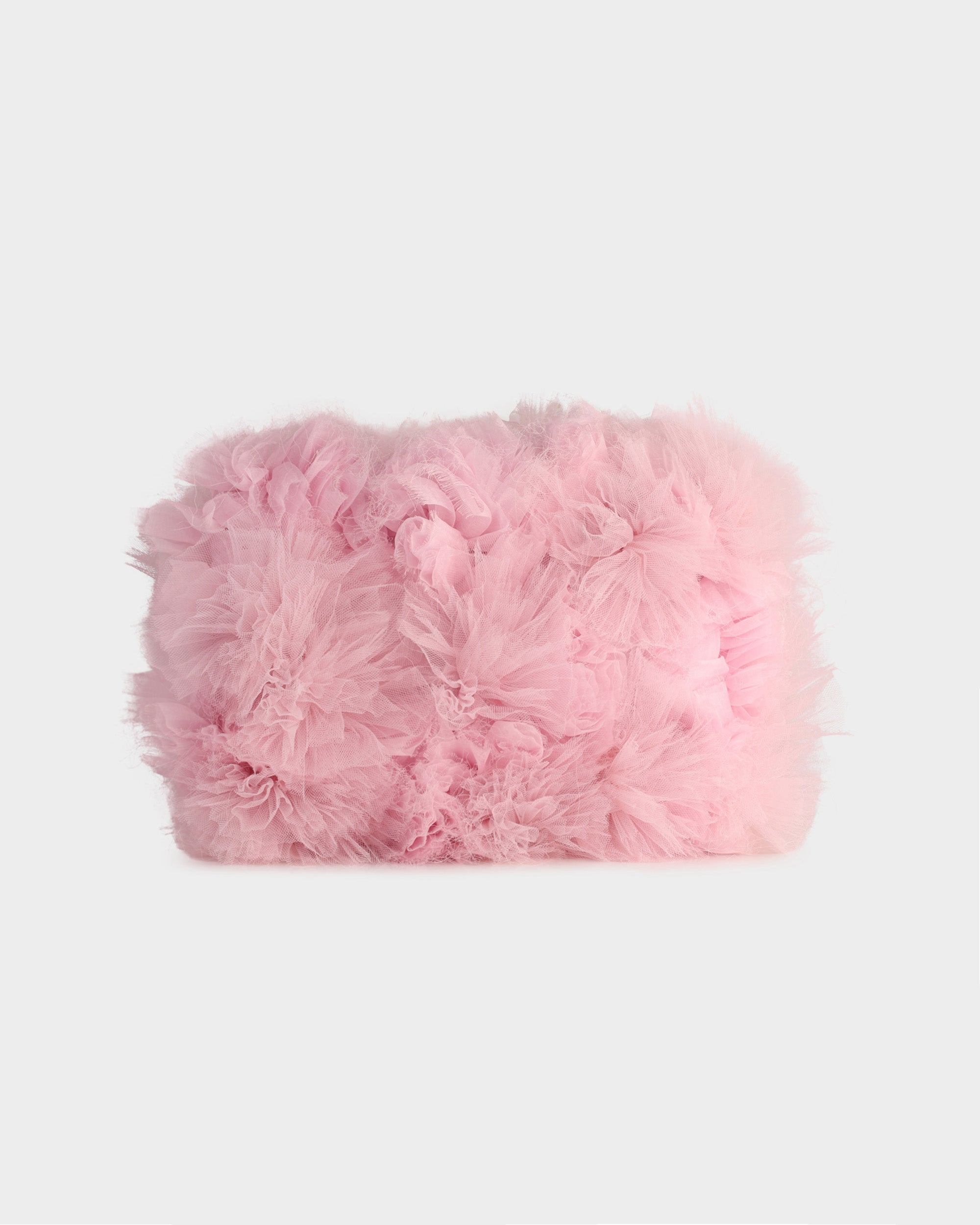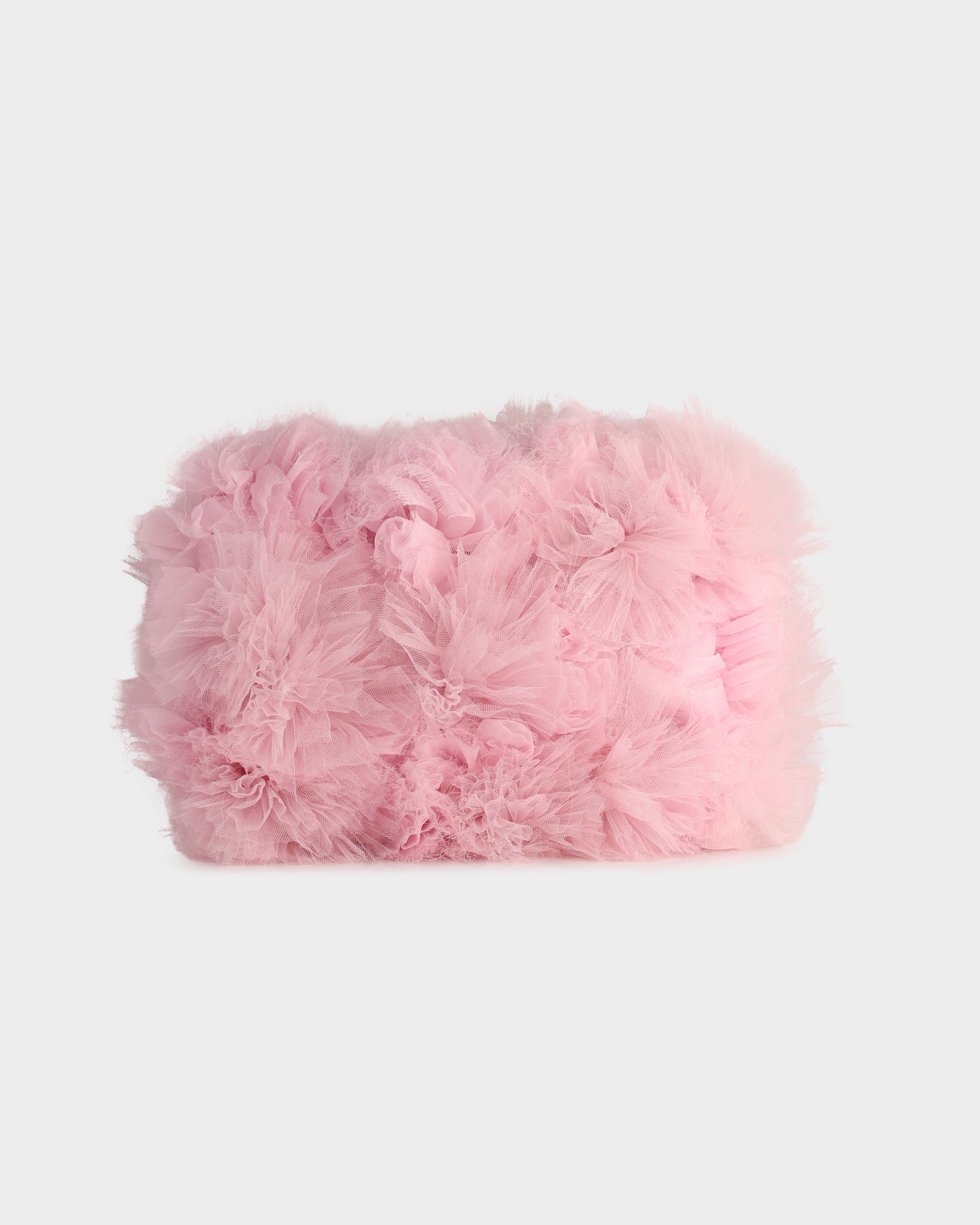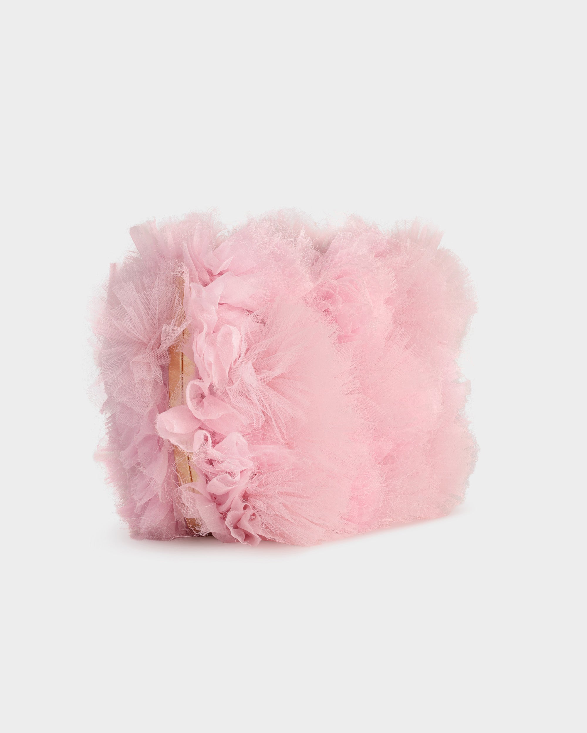 Description: Rushed Tulle and organza clutch with gold hardware.