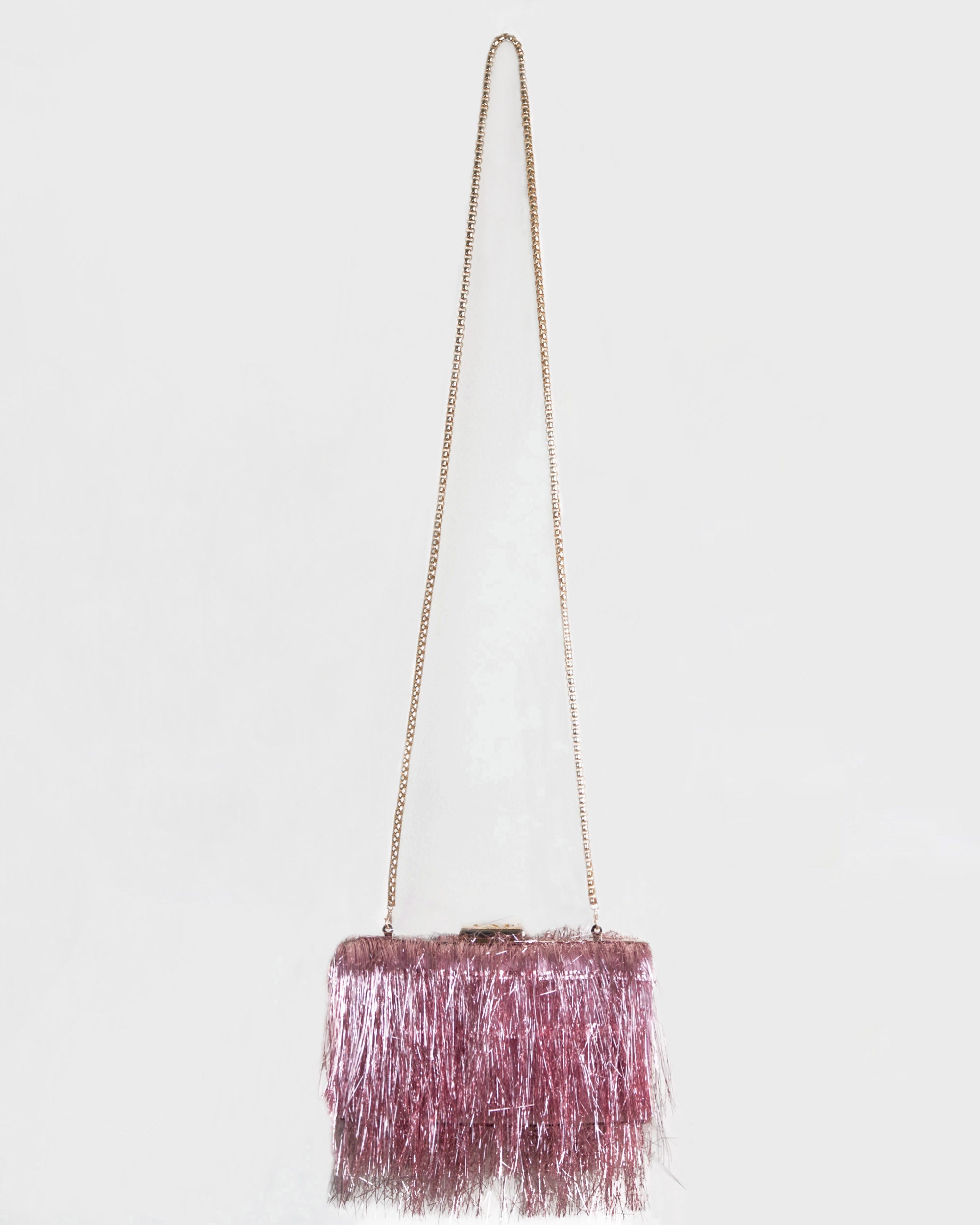 Description: Pink Metallic Fringes bag with gold hardware.