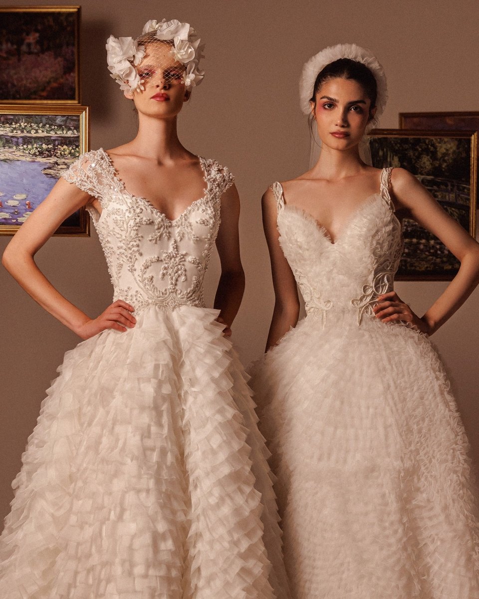 DESCRIPTION: Heart-neckline beaded corset dress and a full wide tulle skirt with a built-in underskirt, paired with a long tulle veil.