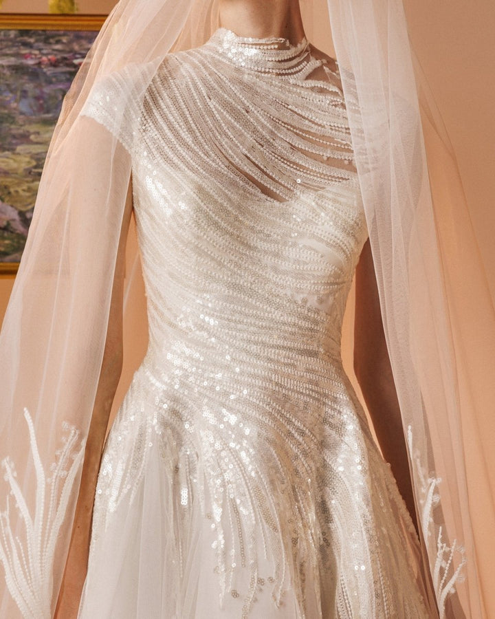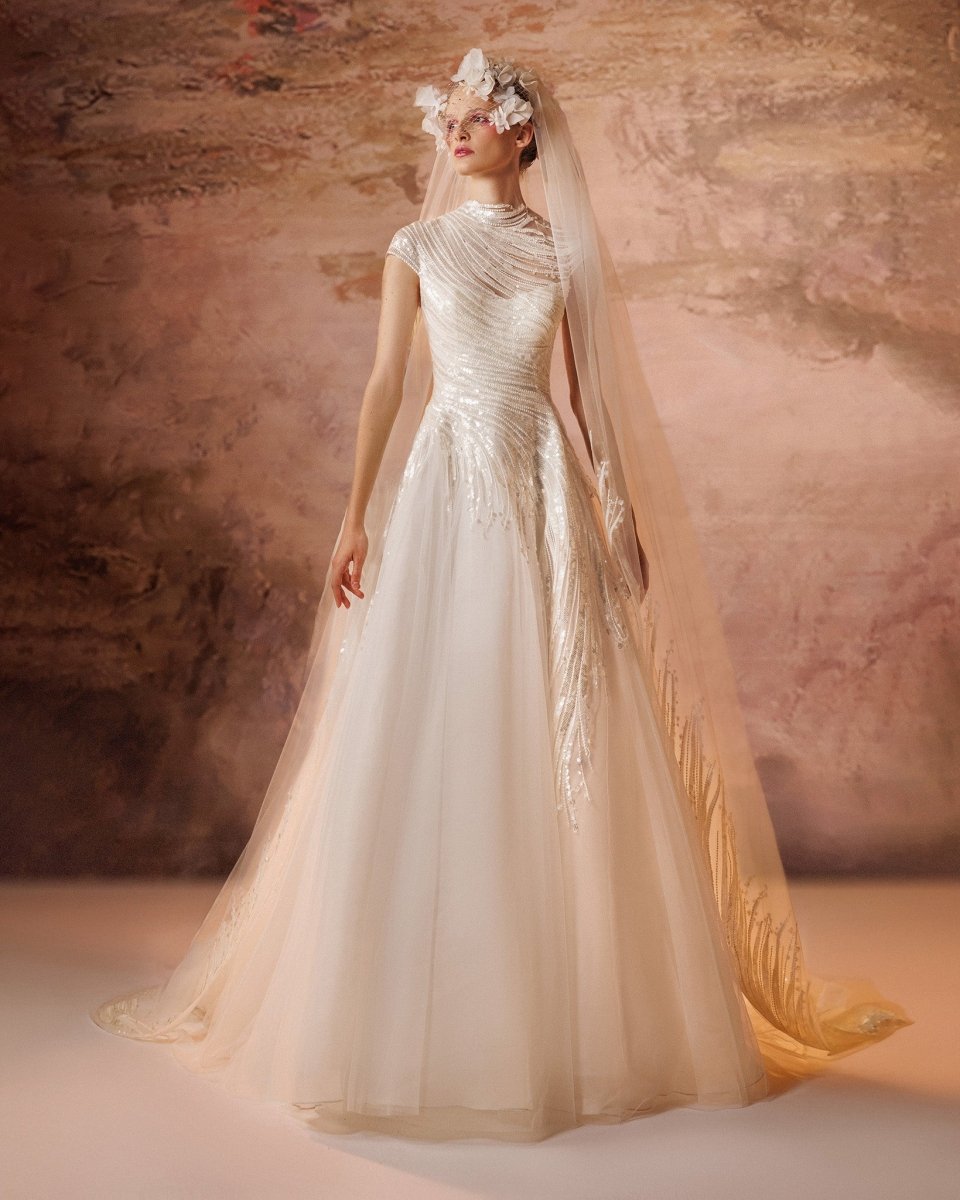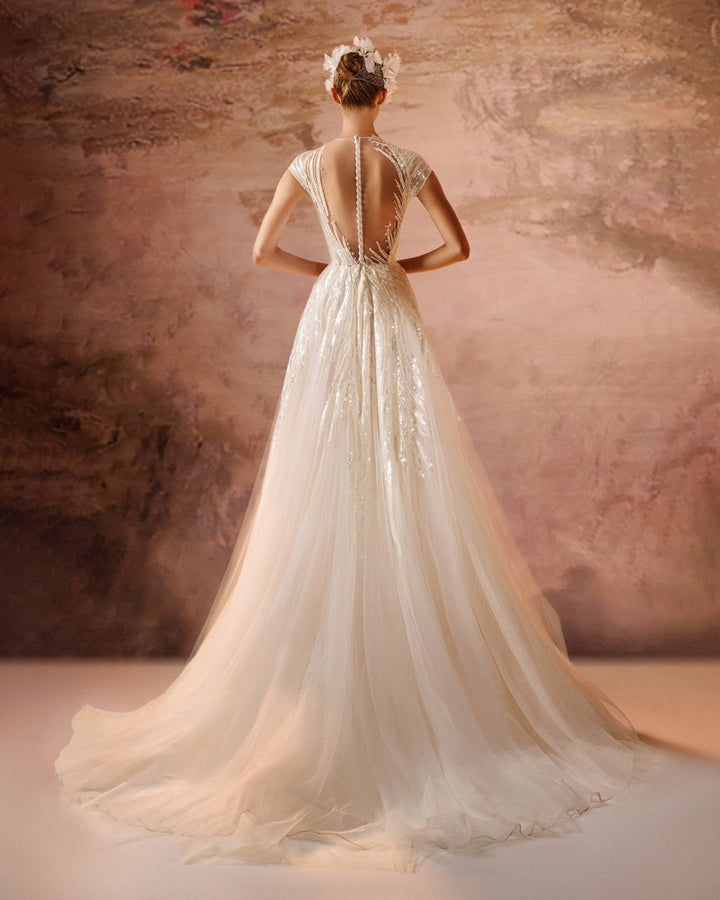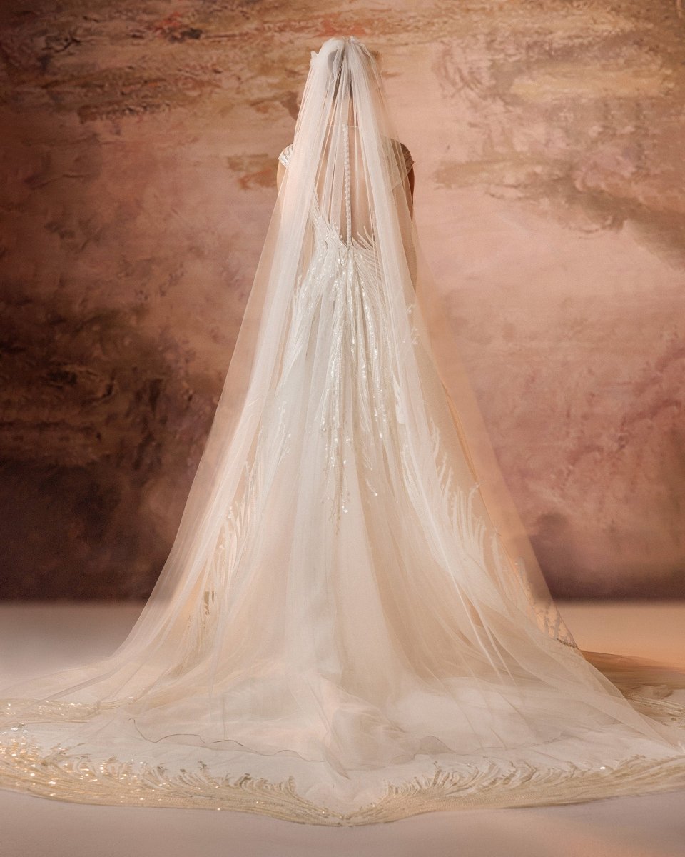 DESCRIPTION: Embroidered gown with an open back and cap sleeves, paired with a long tulle veil.