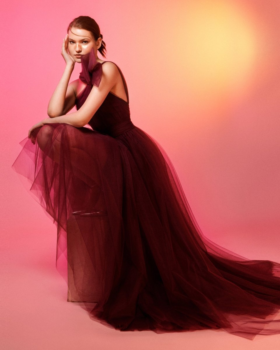 Description: Bow-like design with pleating details flared cut tulle dress.