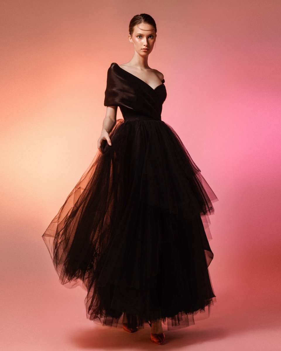 Description: Asymmetrical cuts with draping and ruffled details tulle dress.