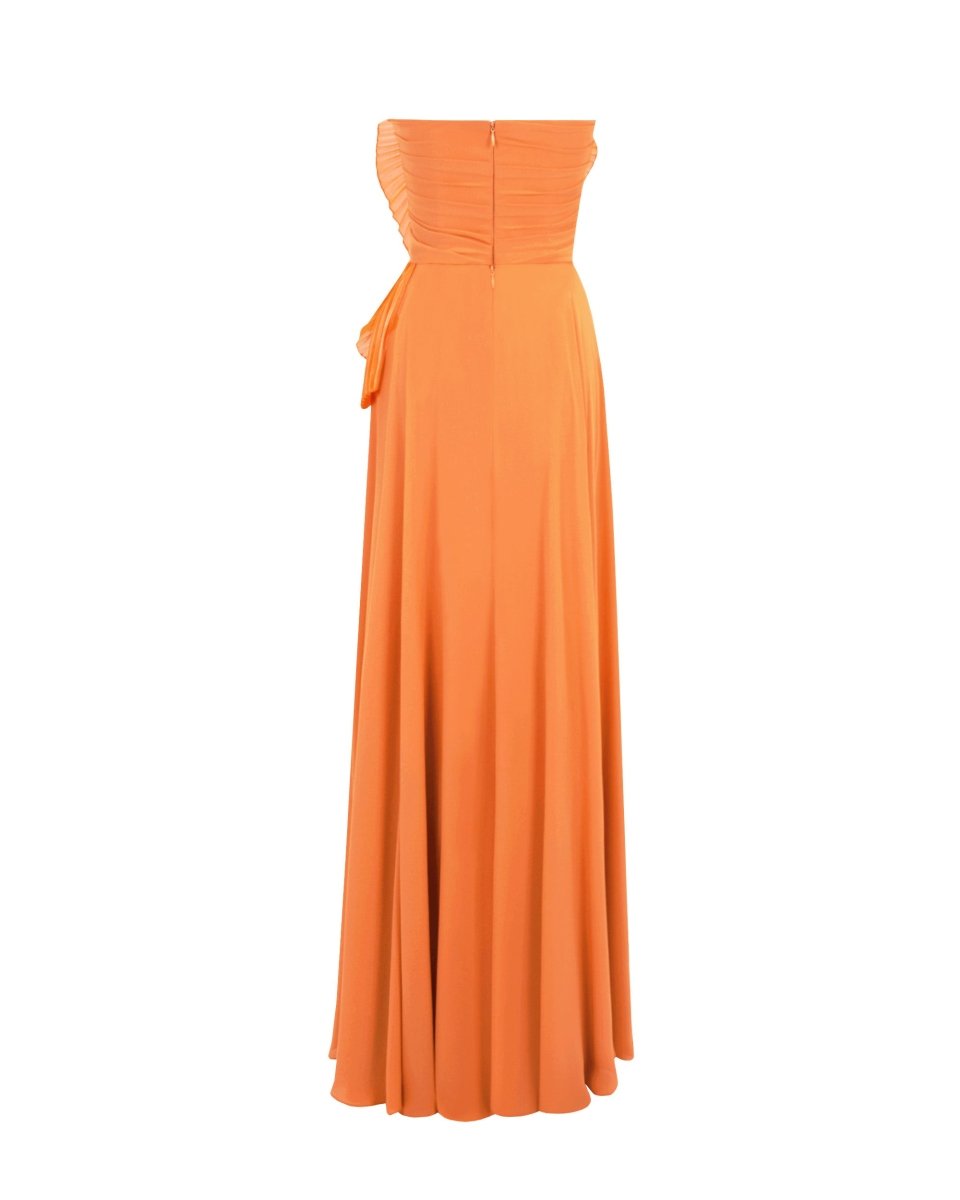 An a-cut orange strapless crepe long evening dress featuring a full bust flower design made with pleated organza fabric.