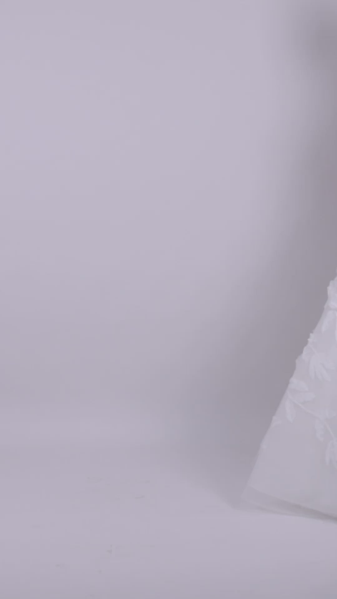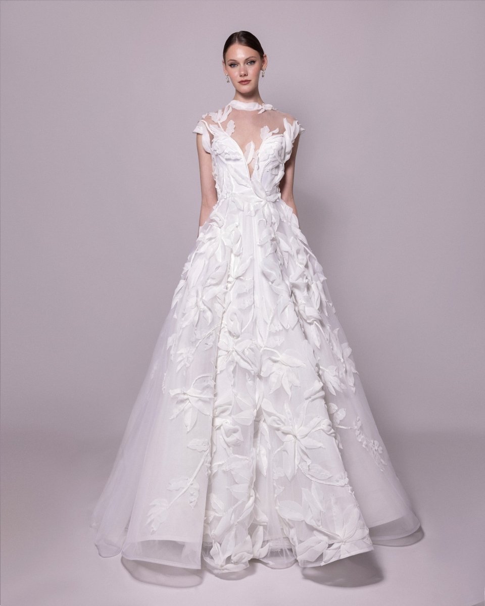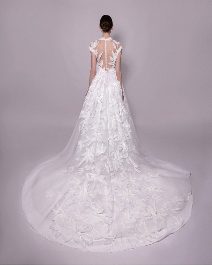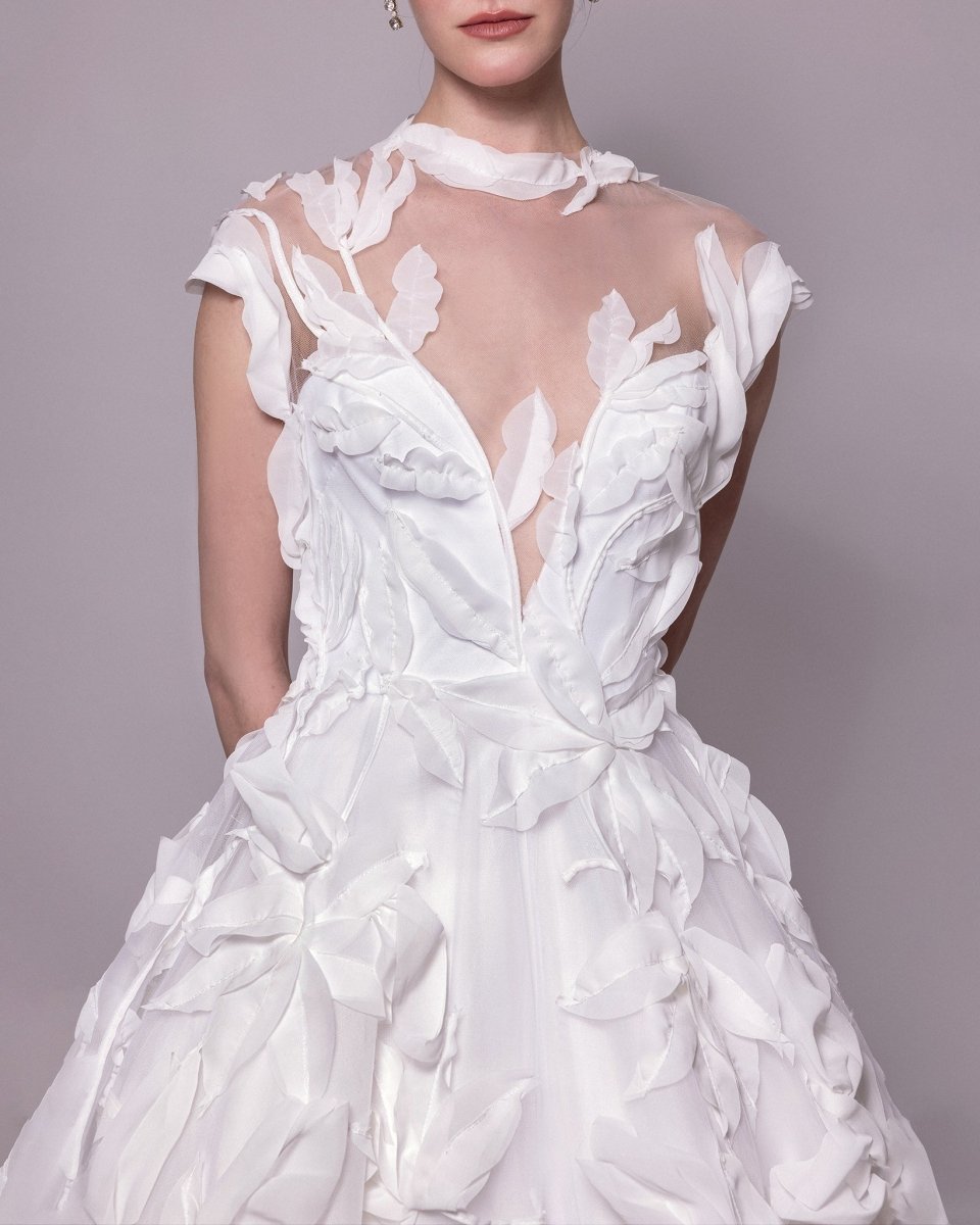 DESCRIPTION: Deep V-neckline dress with cap sleeves and a buttoned down see-through back with a detachable underskirt.