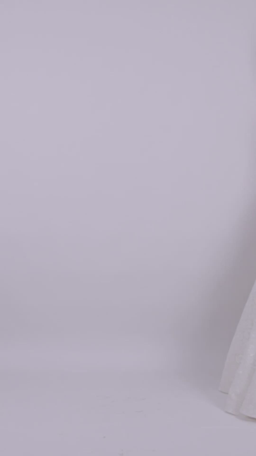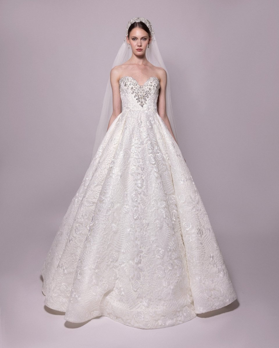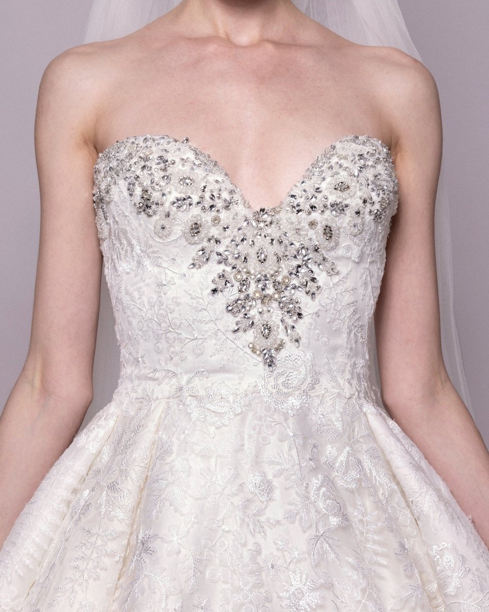 DESCRIPTION:Strapless heart-neckline dress with a beaded corset and back, paired with a beaded headband veil and a detachable voluminous under skirt.