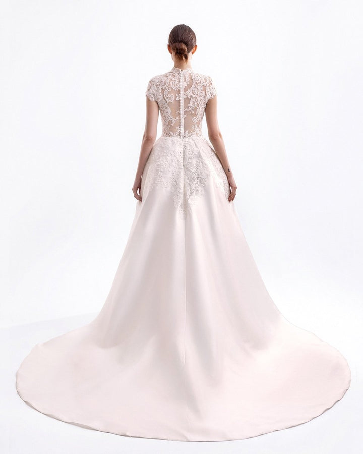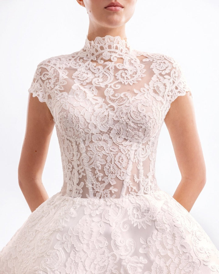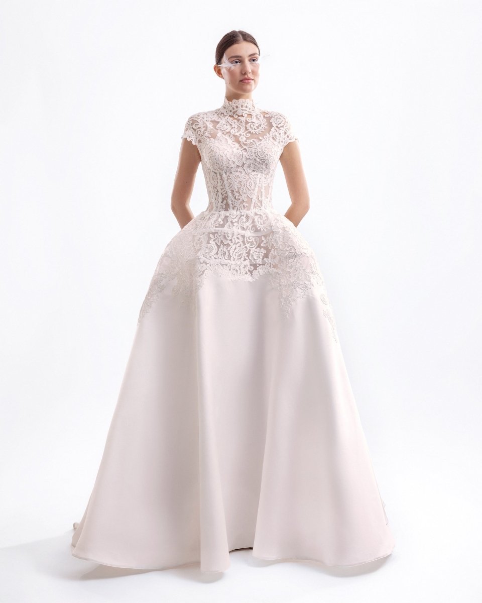 Description: High-collar long dress with a sheer chest, featuring structured pannels and a full cage skirt.