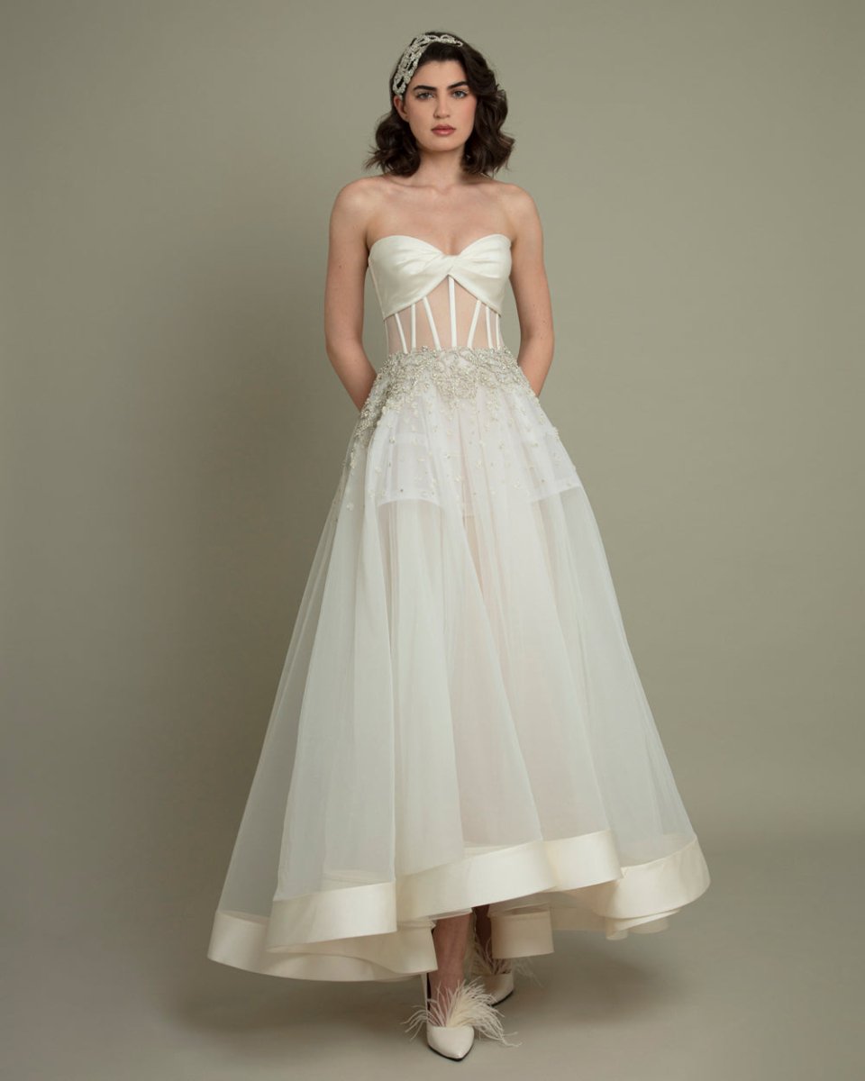 Description: Strapless heart-shaped corset with a wide flared lower part embellished on the waist.