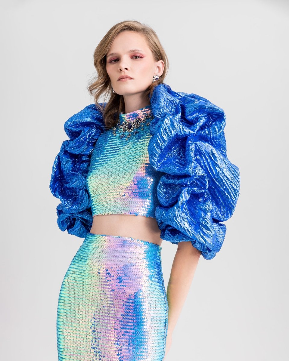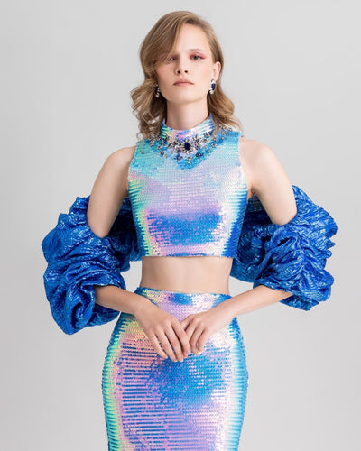 Description: Beaded collar cropped-top paired with a slim pencil skirt and draped bolero.