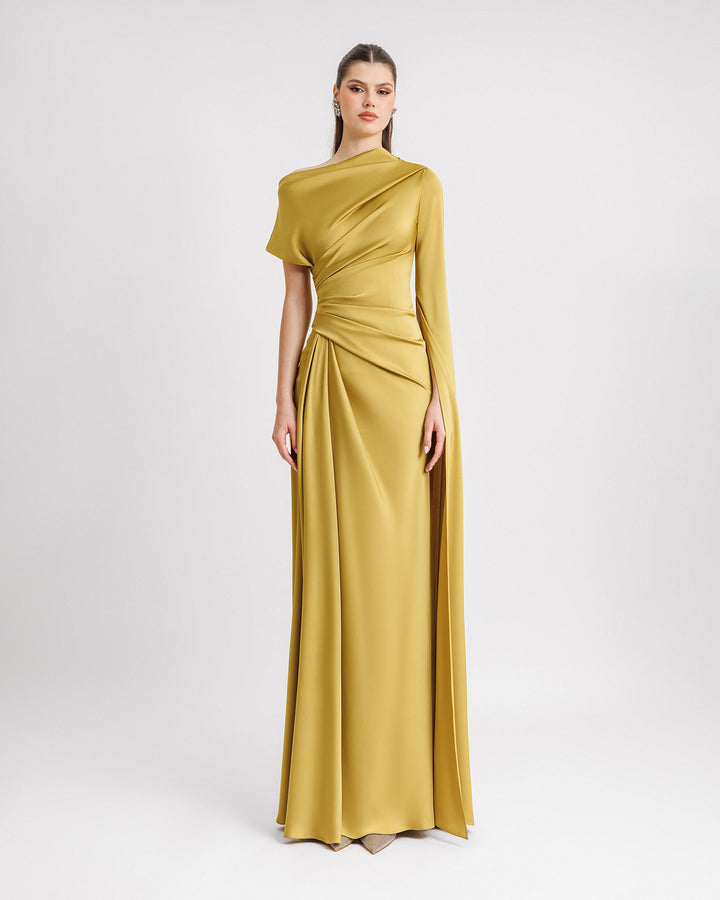 Description: Asymmetrical neckline draped dress with a floor-length sleeve.