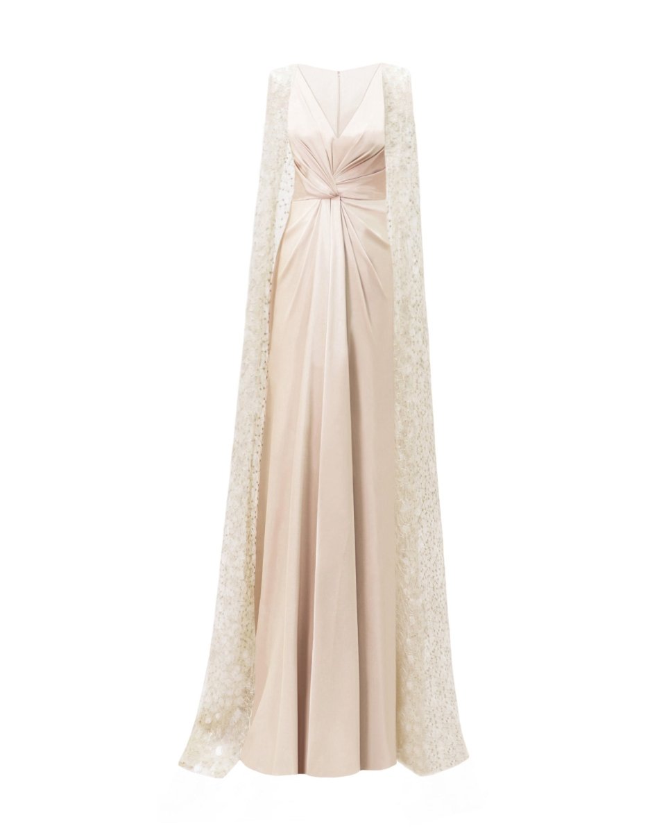 Description: V-neckline draped dress with a slit at the front and a fully beaded cape.