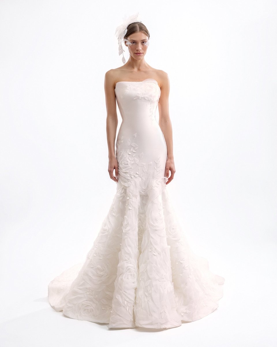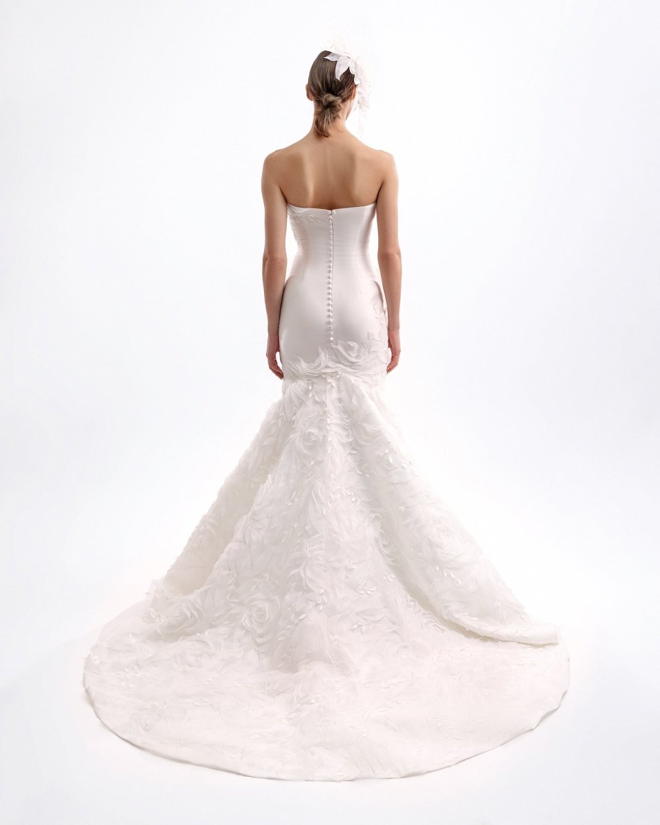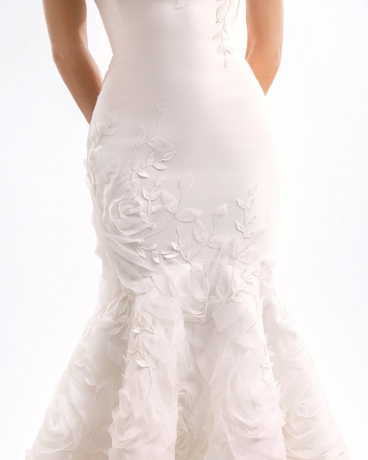 Description: Strapless mermaid-cut dress with floral embroidery degradation over the bust and the skirt.