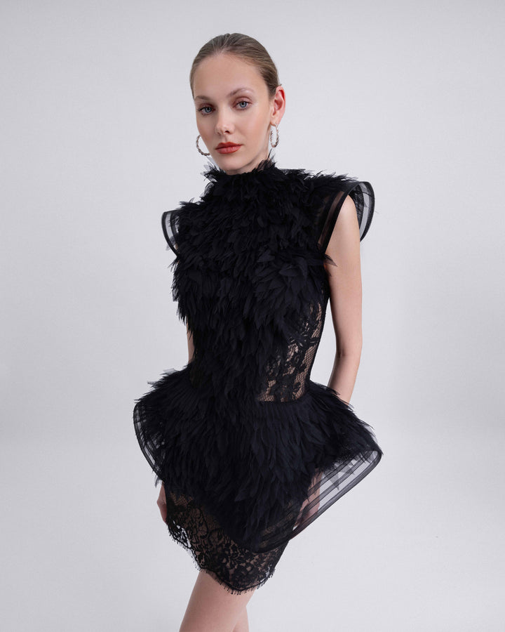 Description: Short lace dress with structured shoulders and ruffled tulle structured waistline.