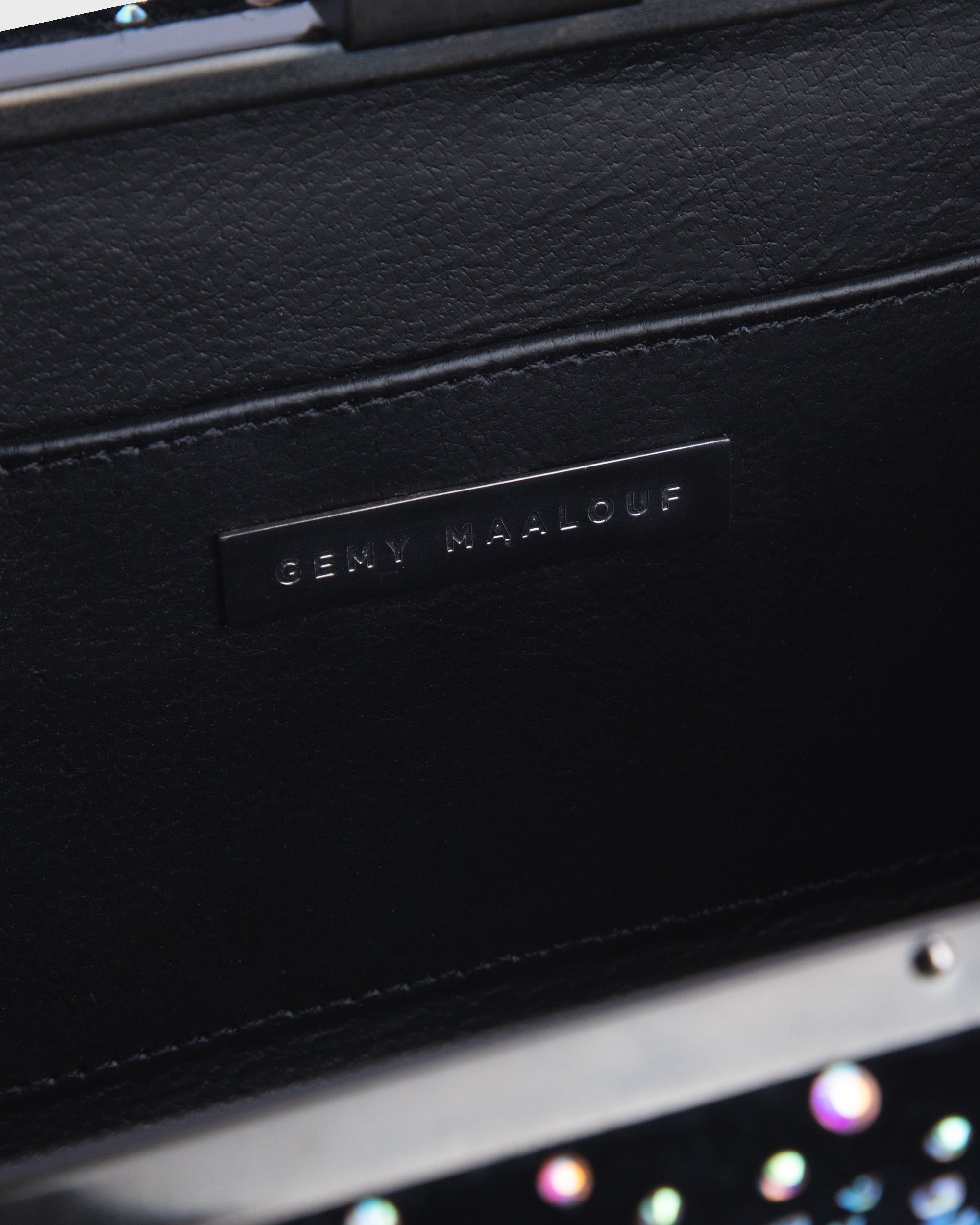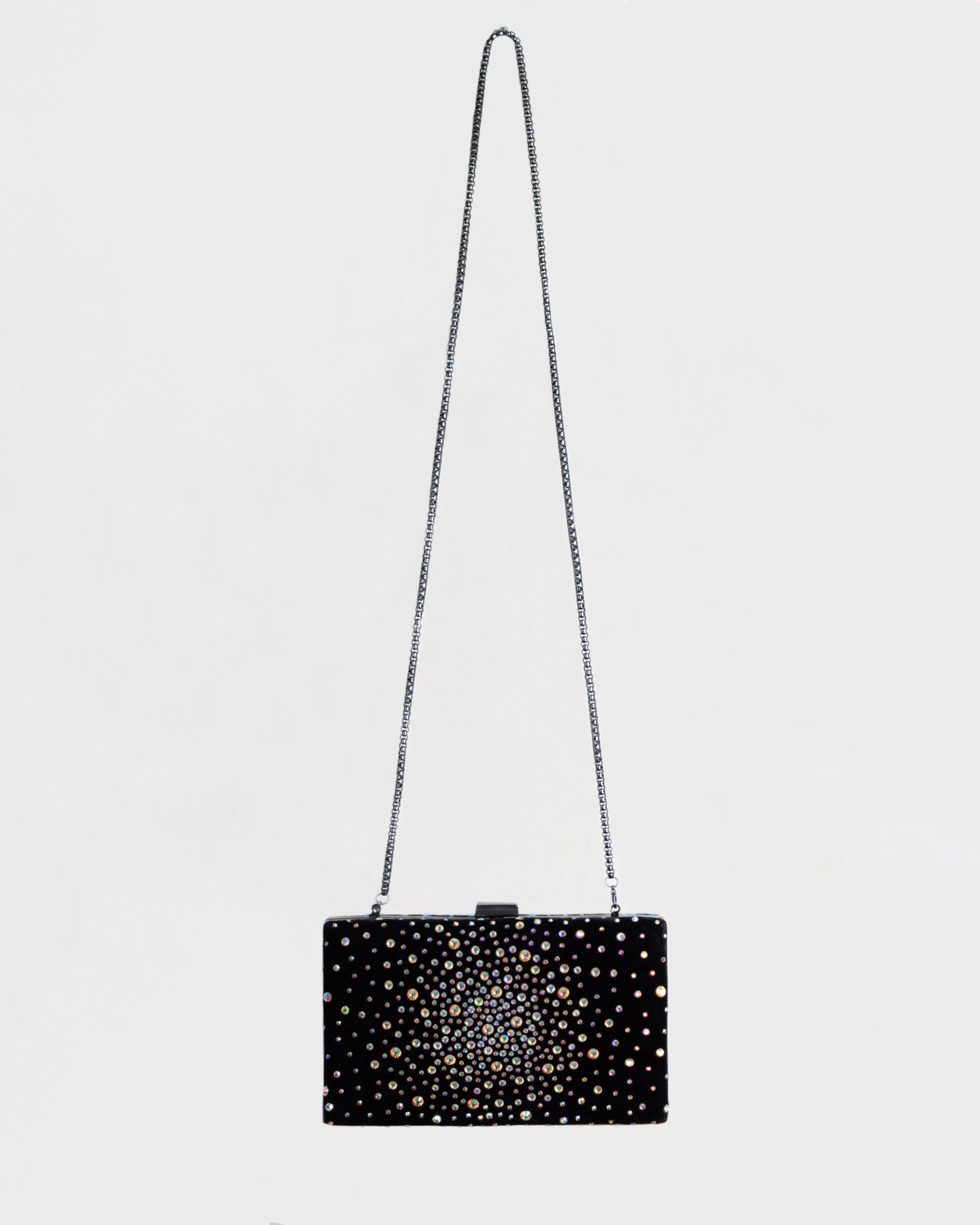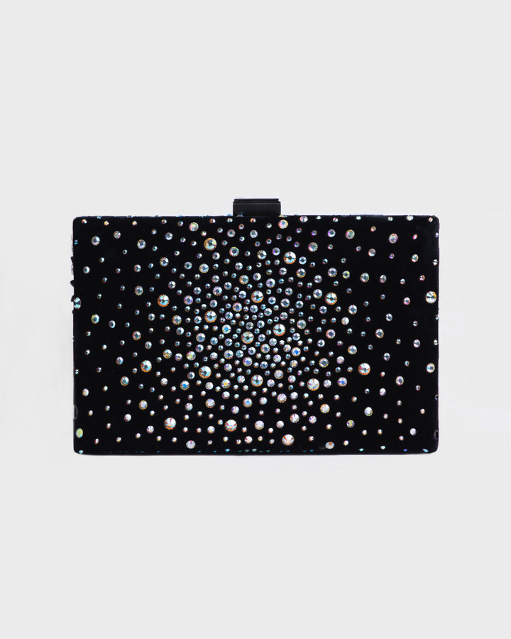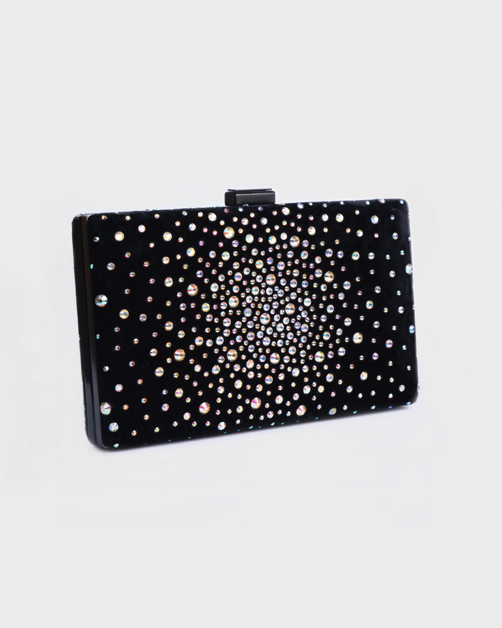 Description: Black velvet clutch with gold and silver rhinestones with black hardware.