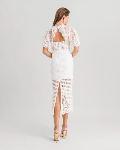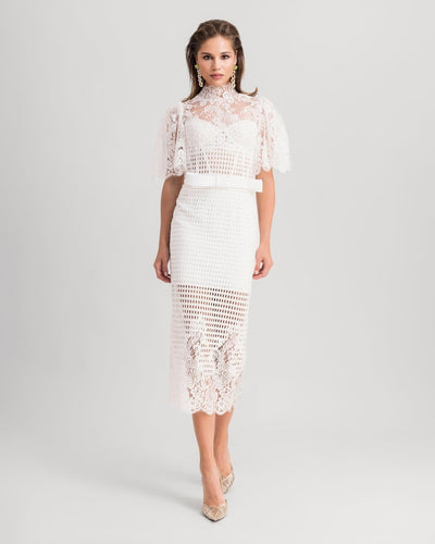 A white midi dress featuring a high-collar lace top with flared sleeves and a bow design at the waist, paired with a midi lace pencil skirt.
