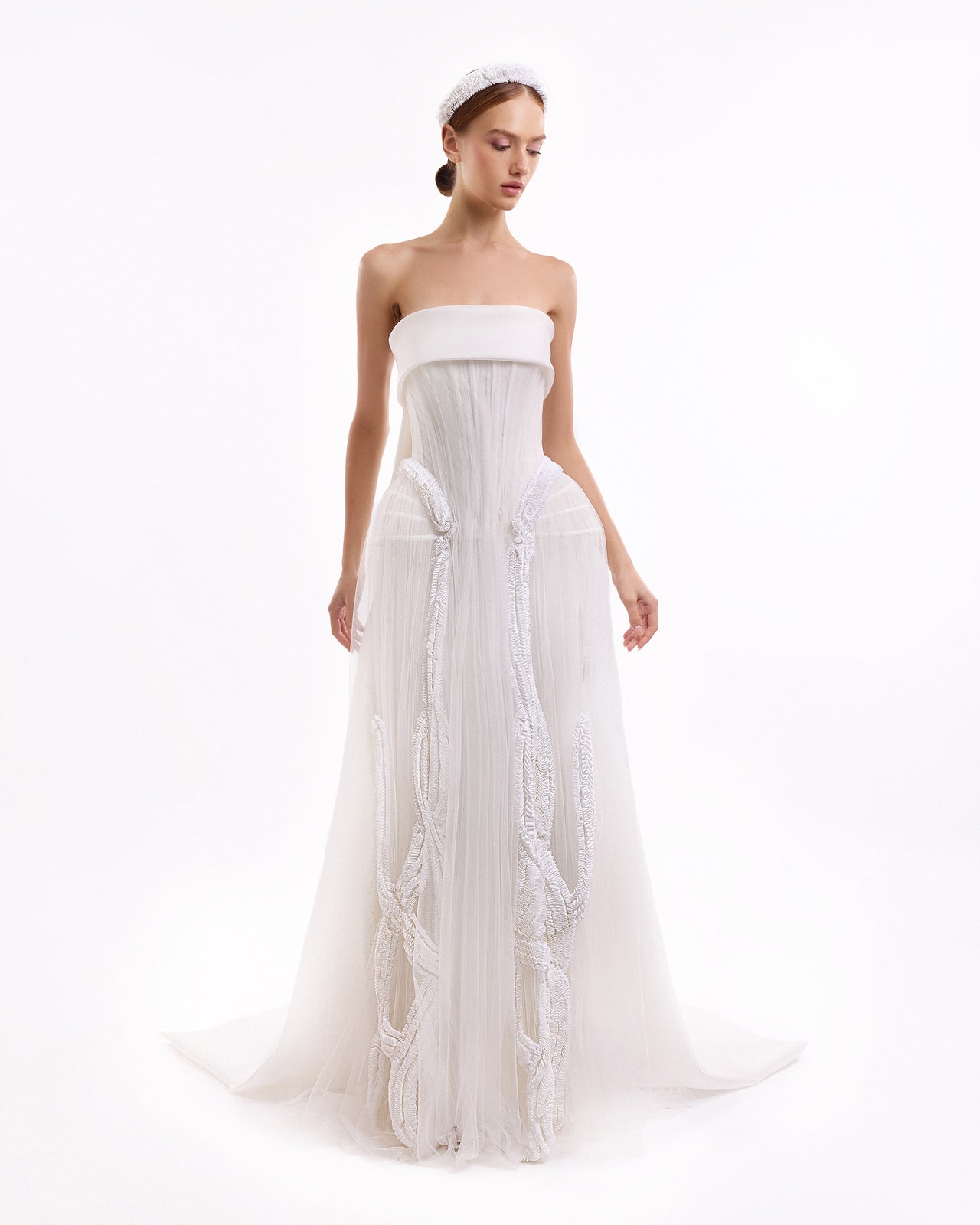 Description: Strapless tulle gown with sheer corset bodice, sculpted hips, and rushed embroideries along the skirt and the detachable cape.