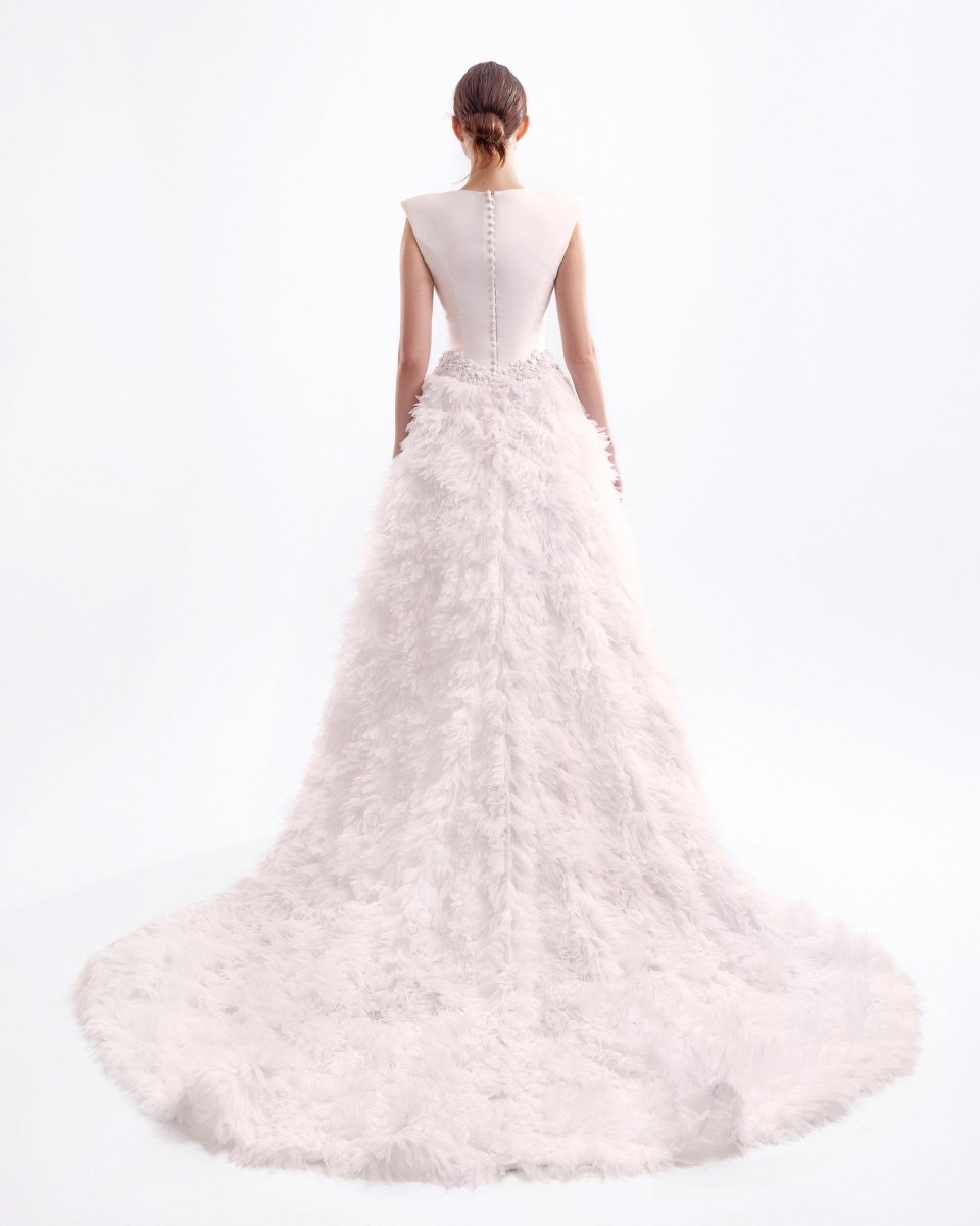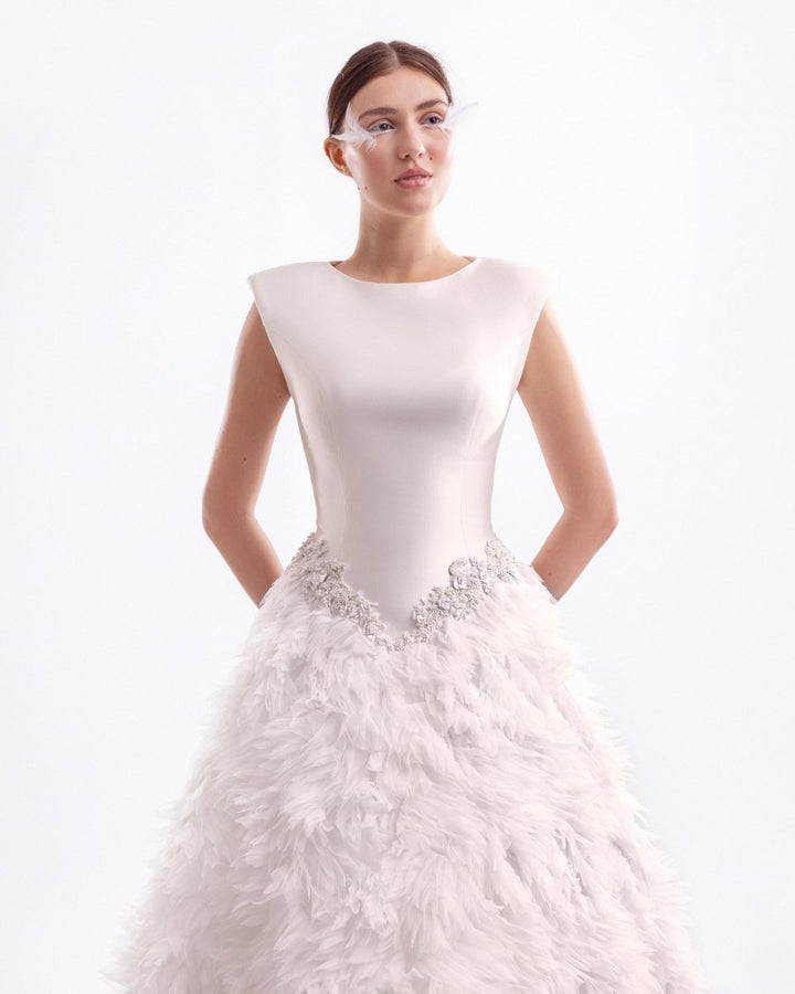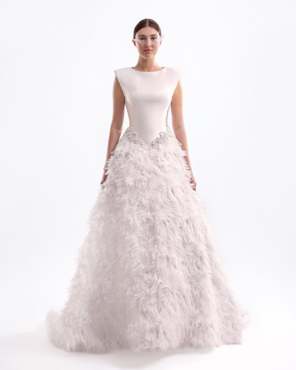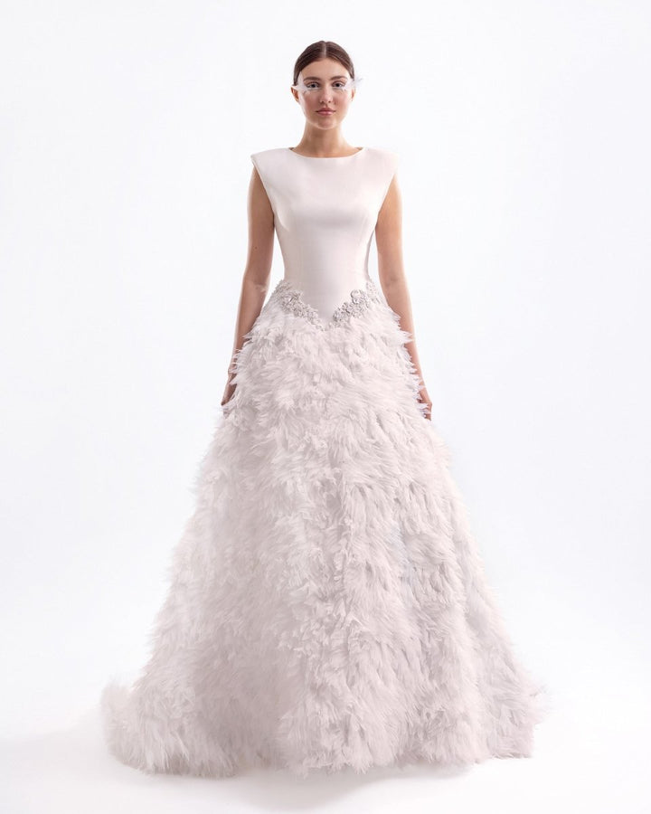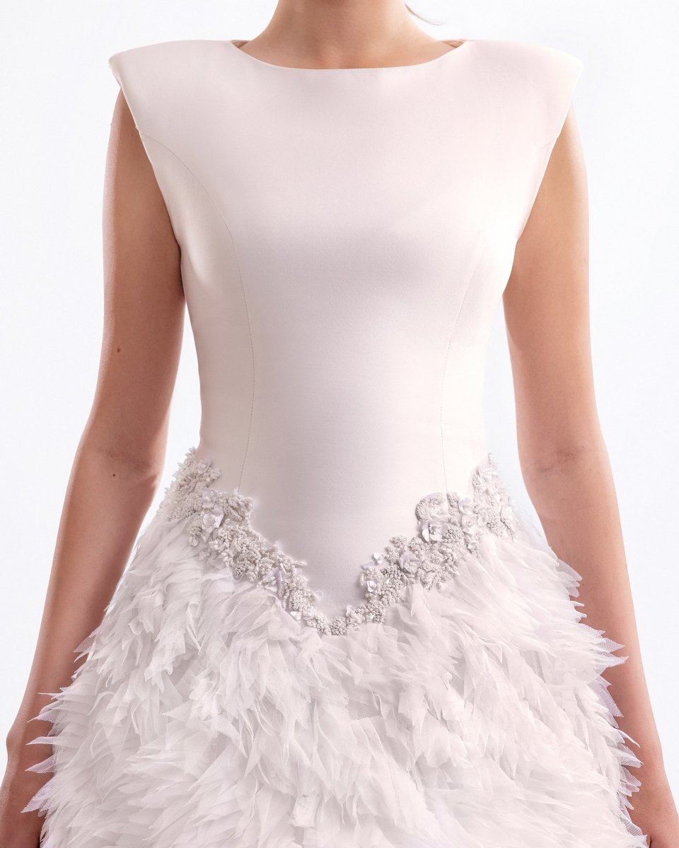 Description: Long dress with padded shoulders, featuring beading along the waistline with a ruffled tulle skirt.