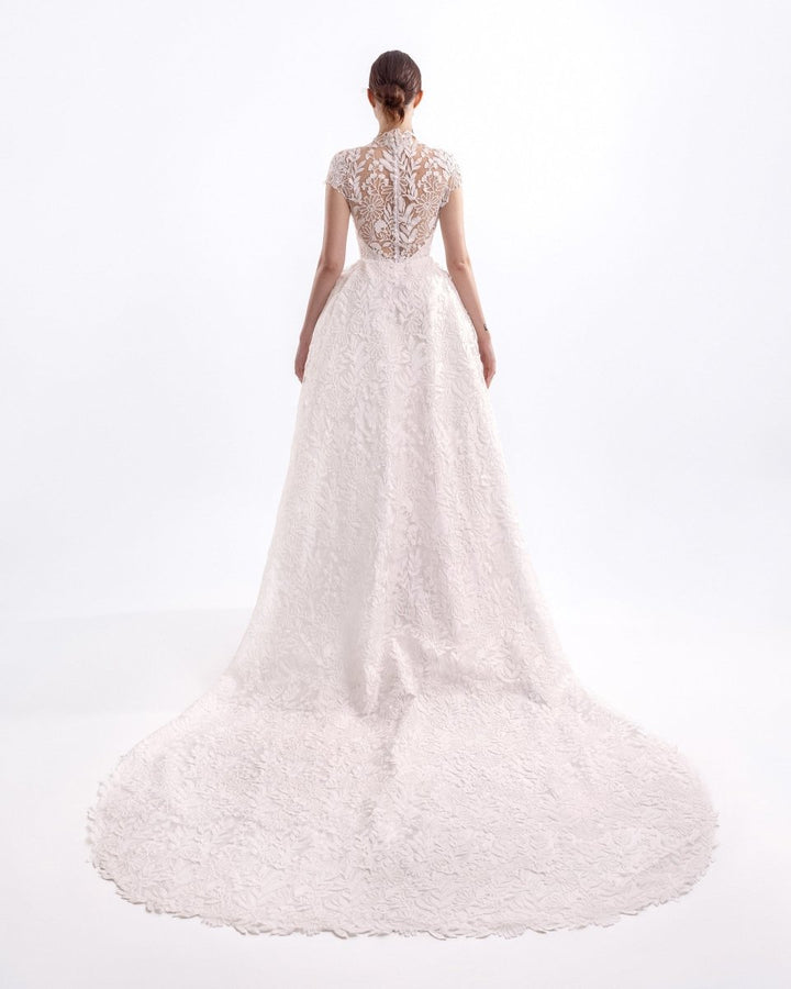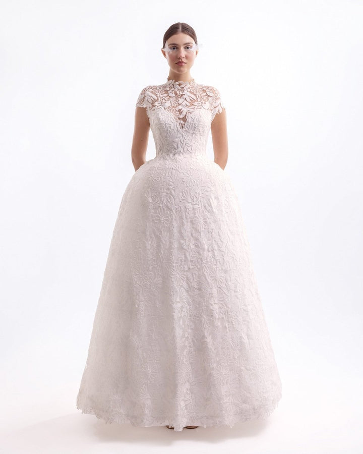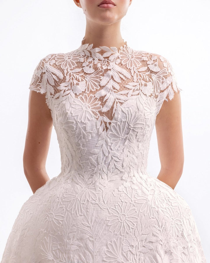 Description: High-collar guipure dress featuring a sheer chest, a lined cage skirt with a detachable tail.